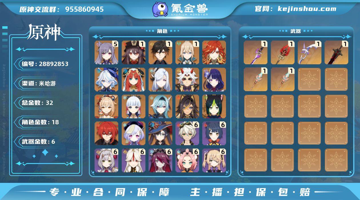 一命胡桃加皮肤宿雪桃红,5命刻晴加皮肤霓裾翩跹,凝光芭芭拉皮肤,一命钟离,带埃洛伊,金32