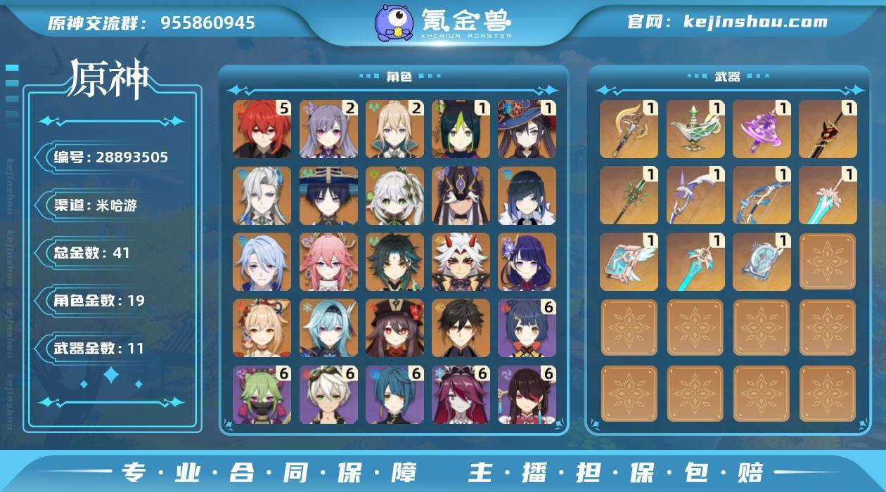 邮箱: 不送邮/死邮 总黄数: 41 冒险等级: 60 5命金色角色: 五命迪卢克 2命金色角色: 二命刻晴,二命琴 1命金色角色: 一命莫娜,一命提纳里 0命金色角色: 优菈,宵宫,钟离,魈,胡桃,雷电将军,荒泷一斗,八重神子,神里绫人,夜兰,赛诺,纳西妲,流浪者,那维莱特 拥有武器: 四风原典,天空之卷,和璞鸢,阿莫斯之弓,天空之傲,天空之刃,终末嗟叹之诗,赤角石溃杵,神乐之真意,千夜浮梦,裁断 1精武器: 四风原典,天空之卷,和璞鸢,阿莫斯之弓,天空之傲,天空之刃,终末嗟叹之诗,赤角石溃杵,神乐之真意,千夜浮梦,裁断