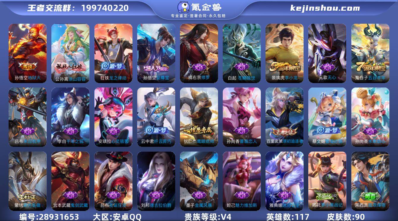 实名: 可修改 贵族等级: V4 英雄数: 117 皮肤数: 90 传说皮: 地狱火 限定皮: 李小龙,至尊宝,五谷丰年