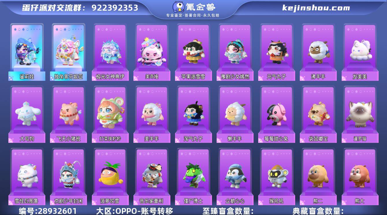 独角兽芬妮亚,鲨莉娃 极光女神典伊,美奇娅,菠萝吹雪,打菜侠妙妙,大耳狗,袋鼠嘟宝,发美美,飞天小猪班尼,沸羊羊,猴吼吼,僵尸博士,京剧少年封闲,懒羊羊,面包狗松松,莓莓甜心兔,美羊羊,苹果派雪雪,企鹅心心,淘气丸子,熊大,熊二,雪怪瓦图鲁,小灰灰,暹罗猫,小太阳葵葵,小演员露希,豫剧少女嫣然,元气丸子,音乐家蕾利,仔仔熊 卖家说:极品号,双至臻加隐藏,可小刀