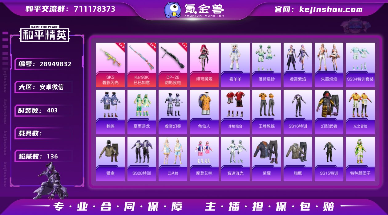热力值:40242 时装数:403 战备数:105 绯穹魔姬 七级SKS-碧影闪光,四级Kar98K-巳巳如意,一级DP-28-豹影疾电 鬼刀降落伞,洛神天依降落伞,梦幻火箭降落伞,炙焰牛王降落伞 喜羊羊,薄荷星砂,凌霄紫焰,SS34特训套装,朱霞炽焰,冰川特警,缤纷果语,滨海假日,长空猛禽,登山爱好者,飞驰魅影,风玲,绯格组合,福星高照,格斗先锋,龟仙人,光之冒险,海岛探路者,鹤鸣,虎虎生威吉莉,湖蓝色名流,黑色伏地魔,黄色名流,黄色运动,红色运动,幻世战舞者,和煦暖阳,幻影武者,酒红色名流,橘黑制服,娇憨猪猪,竞技达人朋克,竞技名士,吉莉礼服,空投萌叽,蓝冰羽,龙的传人,猎鹰,蓝色运动,摩登艾咪,猛禽,萌黄之夏,魅力单车,麻辣教官,萌趣咩咩,萌趣颜团子,明鸳圣池,霓虹极客,怒火燎原,柠萌假日,牛气冲天,牛气满满,轻风白浪,青年教官,云朵鹅,瑞龙福将,荣耀,深蓝色名流,沙漠兵团,SS14特训,SS15特训,SS16特训,SS17特训,SS18特训,SS19特训,SS20特训,SS21特训,SS22特训,SS23特训,SS24特训,SS25特训,SS27特训,SS28特训,SS30特训套装,SS31特训套装,SS32特训套装,SS33特训套装,巳巳如意,探宝勇士,特训学院,甜心亚梦,团圆交子,田园牧歌,特种颜团子,完美偶像,王牌教练,炫蓝之夏,雪绒豹,夏日音浪,醒狮腾龙,虚音幻奏,夏雨游龙,异彩先驱,耀粉歌者,音速流光,玉兔迎春,鱼渊荷华,燕燕于飞,战地菁英,智谋强哥 AC-VAL-天降萌叽,AC-VAL-甜心亚梦,AKM-彩虹符号,AKM-恐龙拽拽,AKM-龙的传人,AKM-萌趣颜团子,AKM-破晓战魂,AKM-夜灯,AKM-灼热熔岩,AMR-暗夜行者,ARX-凌霄紫焰,AUG-天降萌叽,AUG-甜蜜菠萝,AUG-耀粉歌者,DBS-歌者泠鸢,DBS-甜心亚梦,大砍刀-鬼刀,大砍刀-云朵鹅,DP-28-甜心亚梦,GROZA-田园牧歌,GROZA-无面战甲,GROZA-异彩先驱,JS9-凌霄紫焰,Kar98K-飞驰魅影,M16A4-冰河战士,M16A4-蓝色火焰,M16A4-甜心亚梦,M200-乌木金纹,M249-绯穹魔姬,M249-无面战甲,M24-炫彩节奏,M416-蓝色火焰,M416-糯团青竹,M762-彩虹甜喵,M762-绯红前夜,M762-瑞龙福将,M762-天降萌叽,M762-云朵鹅,MG-36-凌霄紫焰,MG3-幻世战舞者,MG3-瑞龙福将,MG3-智耀战神,蜜獾-天降萌叽,蜜獾-绯穹魔姬,蜜獾-娇憨猪猪,Mini14-异彩先驱,Mk14-紫幽梦,Mk47-洛神天依,MP5K-异彩先驱,P1911-无面战甲,P90-飞驰魅影,P90-巳巳如意,P92-凌霄紫焰,P92-紫幽梦,平底锅-飞驰魅影,平底锅-娇憨猪猪,平底锅-凌霄紫焰,平底锅-瑞龙福将,平底锅-甜心亚梦,平底锅-田园牧歌,平底锅-异彩先驱,PKM-紫幽梦,破片手榴弹-萌趣颜团子,破片手榴弹-巳巳如意,QBZ-彩虹符号,QBZ-飞驰魅影,QBZ-洛神天依,S12K-幻世战舞者,S12K-娇憨猪猪,S12K-破晓战魂,S12K-瑞龙福将,S12K-玩趣呆呆,S1897-飞驰魅影,S1897-炫彩节奏,S1897-紫幽梦,S686-红色方程式,S686-生命誓言,SCAR-L-黄金龙骨,SCAR-L-红色方程式,SCAR-L-炫彩节奏,SCAR-L-玉兔迎春,SKS-炫彩节奏,SLR-彩虹符号,SLR-娇憨猪猪,沙漠之鹰-云朵鹅,SPAS-12-田园牧歌,SPAS-12-云朵鹅,