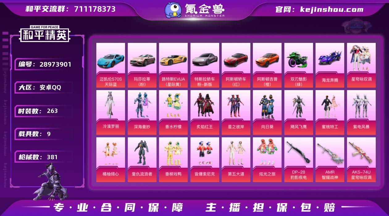 【4满级枪 粉玛莎 8载具 冷漠罗丽 星穹咏叹调 第五大道 炫光之旅 音爆索尼克 垂柳戏鸭 橘柚倾心 梦幻火箭 深海曼妙 蜜桃特工 飓风飞鹰 星之彼岸 香水柠檬 向日葵】可改实名 8载具 19特效枪 17粉装 263套装 381枪械 23王牌印记 138671热力值 双人摩托一双刃魅影(绿) 阿斯顿·马丁DBX(橙) 海龙奔腾 玛莎拉蒂Ghibli(粉) 路特斯EVIJA(星际黄) 僚机-萌免起飞 特斯拉Roadstor(沁心粉) 迈凯伦5705(天际蓝) M762-甜蜜誓约[5级] M24-星之信仰[4级] AKM-炫紫旋律[7级] 汤姆逊-怪笑疯兔[4级] SCAR-L-童趣迷兔[4级] Mini14-荧光虫舞[4级] M416-心之恋语[7级] DP-28-豹影疾电[5级] AMR-智耀战神[6级] MG3-梦幻舞会[7级] AWM-橘柚倾心[4级] AKS-74U-星穹咏叹调[4级] M417-第五大道[4级] Kar98K-绿意幻情[1级] DP-28-枪炮玫瑰[1级] AUG-星之彼岸[7级] GROZA-香水柠檬[4级] DP-28-扶摇飞仙[5级] 冷漠罗丽 星穹咏叹调 第五大道 炫光之旅 音爆索尼克 垂柳戏鸭 复仇流浪者 橘柚倾心 紫电风暴 梦幻火箭 深海曼妙 炙焰红王 蜜桃特工 飓风飞鹰 星之彼岸 香水柠檬 向日葵 N3592 和平精英买号永久包赔带二次营地ID:743686769