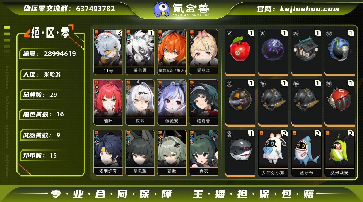 邮箱是否赠送:不送 邮箱:网易邮箱 总黄数:29 五星角色数:16 五星武器数:9 3命「11号」,1命莱卡恩,0命奥菲丝&「鬼火」,0命爱丽丝,0命柚叶,0命仪玄,0命薇薇安,0命耀嘉音,0命浅羽悠真,0命星见雅,0命凯撒,0命青衣,0命朱鸢,0命艾莲,0命猫又,0命珂蕾妲 1精狸法七变化,1精飞鸟星梦,1精霰落星殿,1精防暴者VI型,1精硫磺石,1精拘缚者,1精钢铁肉垫,1精深海访客 2精艾丝弥小姐,2精鲨牙布,2精艾米莉安,2精共鸣布,1精墨丘利,1精狮耶,1精罗宾,1精咔嚓仔,1精格列佛探员,1精赤红莫库斯,1精阿崔巡查,1精巴特勒,1精飚速布,1精插头布,1精左轮布 卖家说:死邮号,便宜卖了