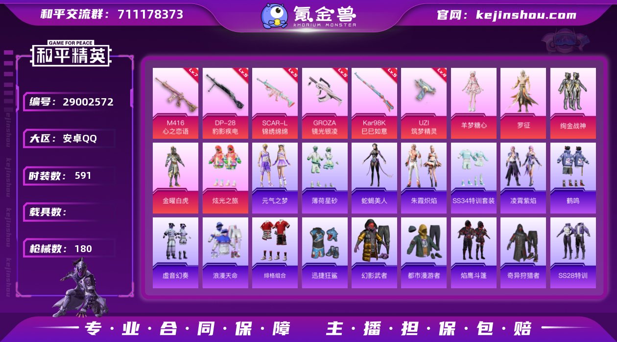 热力值:53940 时装数:591 战备数:129 羊梦糖心,金曜白虎,罗征,炫光之旅,绚金战神 七级M416-心之恋语,五级DP-28-豹影疾电,五级GROZA-镜光银凌,五级Kar98K-巳巳如意,五级SCAR-L-锦绣绵绵,四级UZI-筑梦精灵 春暖花开降落伞,拂晓神骑降落伞,守护天翼降落伞,未来歌姬降落伞 元气之梦,薄荷星砂,蛇蝎美人,凌霄紫焰,SS34特训套装,朱霞炽焰,暗金炫舞,Alan Walker,暗影哥特,冰川特警,冰冻风暴,缤纷果语,北国孤狼,白色伏地魔,白熊同盟,长空猛禽,纯真浪花,动感兔斯基,呆萌铁蟹,都市漫游者,电音精灵,飞驰魅影,绯格组合,飞狐塔尔斯,粉红小猪,疯狂小兔子,福星高照,飞行日记,格斗先锋,龟仙人,光之冒险,幻彩翩翩,鹤鸣,虎虎生威吉莉,湖蓝色名流,黑色伏地魔,黄色伏地魔,灰色格斗者,黄色运动,红色运动,幻世战舞者,幻羽潜行,幻影武者,绝对偶像,军刀雅典娜,惊鸿侠骨,橘黑制服,娇憨猪猪,竞技达人朋克,竞技名士,竞技勇士朋克,极速竞梦,金鼠迎春,街头潮人,锦衣飞扬,空岛之星,龙的传人,猎梦纪元,浪漫天命,蓝色运动,冷焰舞者,Mark.06,漫步者,猛禽,妙红点点,萌黄之夏,魅力单车,麻辣教官,蜜露汐语,懵萌河马,萌趣咩咩,萌趣颜团子,弄潮海豚,霓虹极客,怒火燎原,柠萌假日,牛气冲天,牛气满满,破蛋小黄鸡,破晓战魂,轻风白浪,情公主,绮丽涂鸦,奇趣章鱼,奇异狩猎者,青羽突袭者,云朵鹅,热情海星,热血青春,热血骑手,深海小丑鱼,森林游猎者,神气柴柴,SS18特训,SS19特训,SS20特训,SS21特训,SS22特训,SS23特训,SS24特训,SS25特训,SS27特训,SS28特训,SS31特训套装,SS33特训套装,SS5特训,SS6特训,巳巳如意,酸甜橘柚,探宝勇士,甜蜜告白,甜蜜熊情侣,涂山之恋,甜心亚梦,田园牧歌,特战英豪,特种颜团子,王牌教练,小丑鱼,迅捷狂鲨,炫蓝之夏,许七安,雪绒豹,夏日音浪,血色贵族,雪山精英,虚音幻奏,异彩先驱,跃动心情,耀粉歌者,音速流光,玉兔迎春,野性战心,鹰眼刺客,焰鹰斗篷,鱼渊荷华,耀眼新星,燕燕于飞,战地督导,战地菁英 S12K-霓彩脉冲,AKM-涂鸦街区,Mini14-鸡智如我,AA12-G-纯真浪花,AC-VAL-天降萌叽,AC-VAL-甜心亚梦,AKM-彩虹符号,AKM-竞技角斗士,AKM-龙的传人,AKM-萌趣颜团子,AKM-霓彩节奏,AKM-霓虹街区,AMR-妙红点点,ARX-凌霄紫焰,AUG-幻影战神,AUG-天降萌叽,AUG-耀粉歌者,AWM-垂柳戏鸭,AWM-纯真浪花,AWM-黄金龙骨,AWM-焰鹰斗篷,爆炸猎弓-惊鸿侠骨,爆炸猎弓-天星战神,DBS-暗星紫秘,DBS-彩虹符号,DBS-净心行者,DBS-甜心亚梦,DBS-焰鹰斗篷,大砍刀-2P战斗服款,大砍刀-云朵鹅,DP-28-彩虹符号,DP-28-甜心亚梦,DP-28-焰鹰斗篷,G36C-懵萌河马,GROZA-恐龙拽拽,GROZA-懵萌河马,GROZA-田园牧歌,GROZA-异彩先驱,GROZA-影袭,JS9-凌霄紫焰,Kar98K-彩虹符号,Kar98K-飞驰魅影,Kar98K-幻影战神,Kar98K-炫彩节奏,Kar98K-影袭,Kar98K-终极赛罗,M16A4-红色方程式,M16A4-幻世战舞者,M16A4-甜心亚梦,M200-惊鸿侠骨,M200-乌木金纹,M249-妙红点点,M249-破晓战魂,M249-无面战甲,M24-炫彩节奏,M24-影袭,M416-黄金狮王,M416-红色方程式