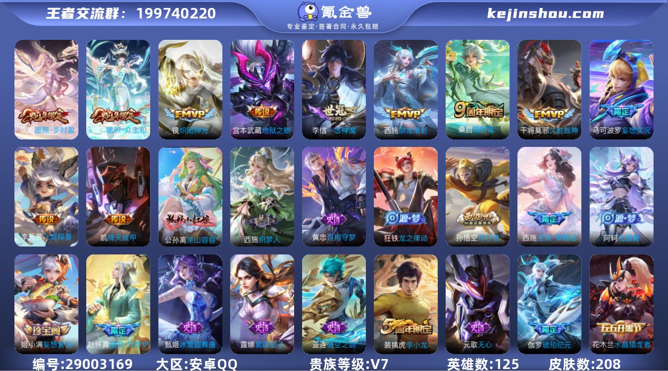 【贵族7 208皮肤11传说1星传说6个性按键224夺宝幸运值】皮肤数: 208 传说皮: 绛天战甲,久胜战神,炽阳神光,一念神魔,地狱之眼,飞鸢探春,游龙清影,妄想实况 限定皮: 李小龙,孙行者,至美·乘鲤谣,鸣野蒿,逐霄战戟,愿照·众生和,愿照·岁时盈