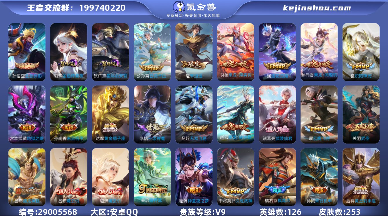 【准v10极品打野对抗号猴子典藏吕布貂蝉曦玄引孙尚香孙策赵云龙年限定33个高质量传说多限定43个个性按键】实名: 可修改 性别: 男号 贵族等级: V9 英雄数: 126 皮肤数: 253 荣耀水晶: 全息碎影 星传说: 金色仲夏夜,星际治安官 传说皮: 黄金狮子座,黄金射手座,云鹰飞将,绛天战甲,久胜战神,炽阳神光,一念神魔,末日机甲-孙尚香,地狱火,仲夏夜之梦,地狱之眼,飞鸢探春,李逍遥,时之恋人-刘备,超时空战士-狄仁杰,末日机甲-孙策,挚爱之约,无双飞将,电玩·雷克斯,妄想实况,遇见神鼓,澜逐花归海,乘龙·问璇玑,乘龙·铭钟鼎,乘龙·淬吴钩,貂蝉曦玄引,吕布曦玄引,云诺千山 限定皮: 遇见飞天,梁祝,武圣,岱宗,天狼狩猎者,青龙志,武陵仙君,傲雪梅枪,枫霜尽,五谷丰年,山海·玄木吟,鸣野蒿,逐霄战戟