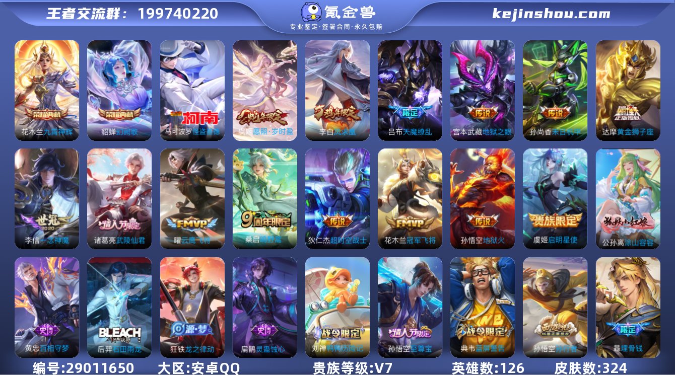 贵族等级:V7 典藏皮肤数:2 珍品无双皮肤数:0 无双皮肤数:0 珍品传说皮肤数:1 传说皮肤数:14 史诗皮肤数:102 皮肤数:324 英雄数:126 段位:钻石