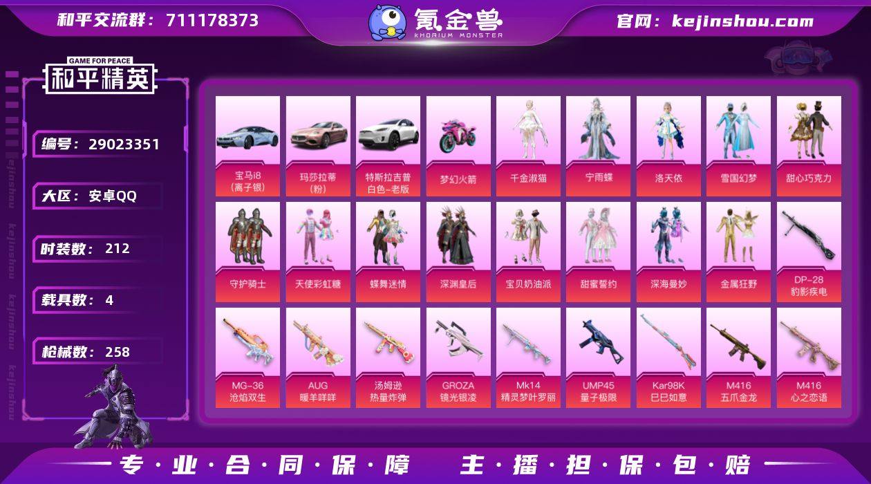 【3载具 14特效枪 洛天依 宁雨蝶 千金淑猫 天使彩虹糖 宝贝奶油 甜心巧克力 甜蜜誓约 梦幻火箭 雪国幻梦 蝶舞迷情】可改实名 4载具 14特效枪 14粉装 212套装 258枪械 9王牌印记 95829热力值 宝马18(离子银) 双人摩托-梦幻火箭 特斯拉ModelX珍珠白 UMP45-量子极限[5级] Mk14-精灵梦叶罗丽[5级] M762-电糖天使[5级] SCAR-L-锦绣绵绵[5级] M416-心之恋语[7级] DP-28-豹影疾电[4级] MG-36-沧焰双生[4级] 汤姆逊-热量炸弹[5级] Mk14-甜梦熊击[1级] AUG-暖羊咩咩[5级] M416-五爪金龙[1级] Kar98K-巳巳如意[4级] AKM-甜心宝贝[5级] GROZA-镜光银凌[5级] 洛天依 宁雨蝶 千金淑猫 天使彩虹糖 宝贝奶油 甜心巧克力 甜蜜誓约 深海曼妙 金属狂野 梦幻火箭 深渊皇后 雪国幻梦 守护骑士 蝶舞迷情 N3746 和平精英买号永久包赔带二次营地ID:716712775