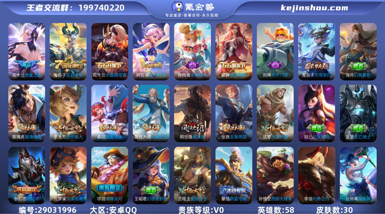 贵族等级:V0 典藏皮肤数:0 珍品无双皮肤数:0 无双皮肤数:0 珍品传说皮肤数:0 传说皮肤数:1 史诗皮肤数:6 皮肤数:30 英雄数:58 段位:黄金 卖家说:号多了想出这一个喜欢花木兰这个英雄的可以看看 有他的限定皮