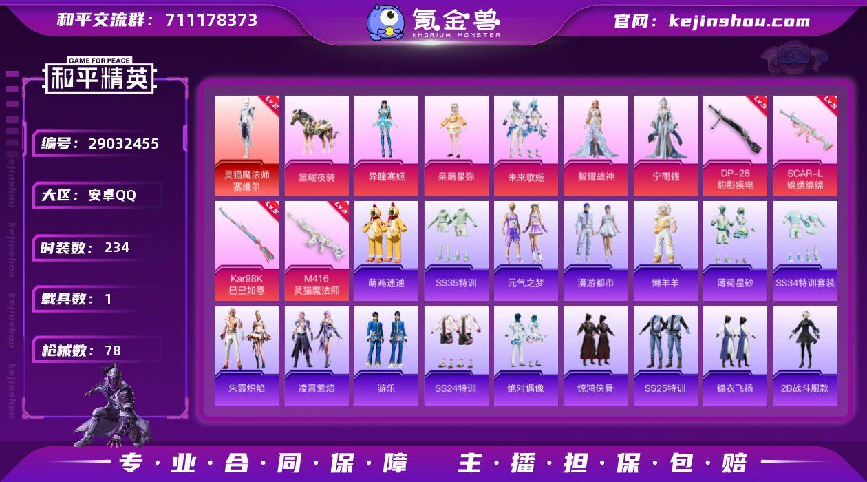 安卓QQ BG15122 -4王牌印记-5粉装-4特效枪-1载具-27498热力值-57套装-78枪皮-2卓越印记-0传奇印记 【5粉装】,宁雨蝶,异瞳寒姬,智耀战神,未来歌姬,呆萌星弥 【4特效枪】SCAR-L-锦绣绵绵-5级 M416-灵猫魔法师-3级 Kar98K-巳巳如意-5级 DP-28-豹影疾电-5级 【1红装】,灵猫魔法师-塞维尔/2级, 【3稀有紫装】,2B战斗服款,龟仙人,许七安, 【1稀有载具】,黑曜夜骑, 【57稀有时装】,塞维尔/2级,SS35特训,SS33特训,SS32特训,SS34特训,朱霞炽焰,龟仙人,游乐,懒羊羊,许七安,凌霄紫焰,萌鸡速递,元气之梦,墨青刃影,蜜露汐语,漫游都市,薄荷星砂,2B战斗服款,异域银装,白糯汤圆,星途旅人,战术大师,巳巳如意,闪电轻猫,明鸳圣池,决胜时刻,豚鼠丹丹,雪兔飞飞,海滨突袭者,SS26特训,酷萌兔限定,空岛之星,黑色伏地魔,竞技名士,长空猛禽,冷焰舞者,惊鸿侠骨,春光漫游,青春校园,燃烧卡路里,极速红龙,破蛋小黄鸡,快闪甜心,霓虹街区,SS27特训,绝对偶像,SS23特训,天籁歌者,吉莉礼服,SS24特训,SS25特训,锦衣飞扬,