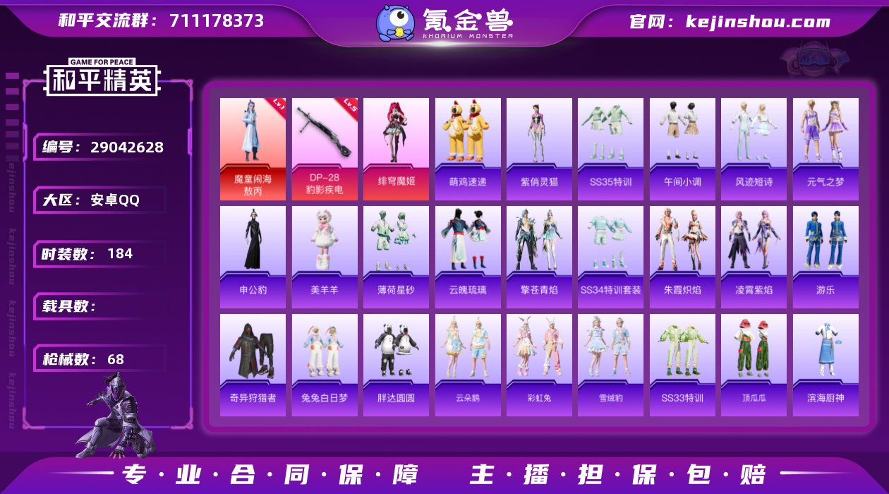 【1红装1稀有1粉装1特效枪魔童闹海-敖丙奇异狩猎者】 安卓Q区-19811热力值-3印记-45套装-68枪皮 【1红装】魔童闹海-敖丙【1稀有】 奇异狩猎者【1粉装】 角色-绯穹魔姬【1特效枪】 DP-28-豹影疾电(5级)【5热门】 AG战队服 浪漫天命 小丑鱼 胖达圆圆 暗影哥特(红眼罩)【2飞行器】 飞天猪飞行器 灵珠游龙飞行器【1背包】 深海小丑鱼背包 营地ID:994541471