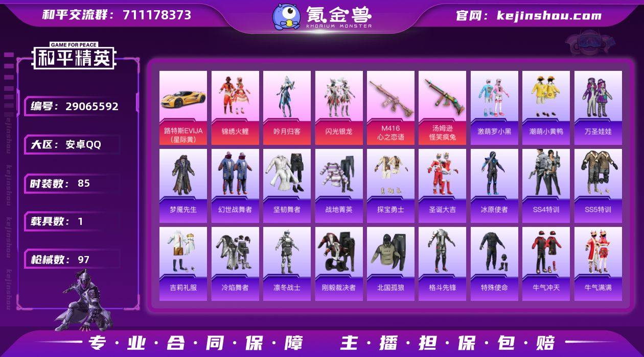 可改实名【 闪光银龙 吟月归客 锦绣火鲤 狂沙舞者 老六服】1车 2特效枪1满级 3粉装 85套装 97枪械 闪光银龙 吟月归客 锦绣火鲤 狂沙舞者 雪山精英 路特斯EVIJA(星际黄) 满级M416-心之恋语 2级汤姆逊-怪笑疯兔 王牌印记2 热力值33589 N3857和平精英买号永久包赔带二次营地ID:739415538
