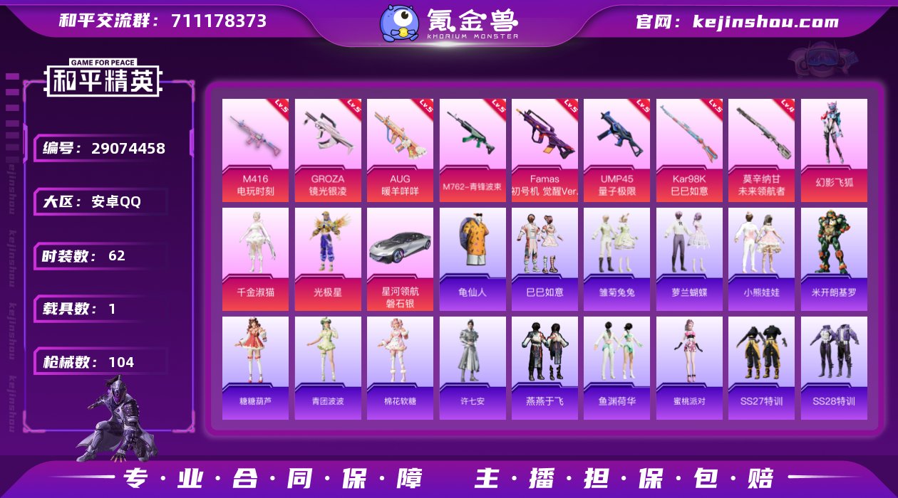【商品标题】:安卓 手Q-3粉装-8特效枪-1载具-32146热力值-5印记-62套装-104枪皮 【稀有载具】:星河领航(磐石银) 【特效枪等级】:M416-电玩时刻(五级),GROZA-镜光银凌(五级),AUG-暖羊咩咩(五级),M762-青锋波束(五级),Famas-初号机 觉醒Ver.(五级),UMP45-量子极限(五级),Kar98K-巳巳如意(五级),莫辛纳甘-未来领航者(四级) 【优质套装】:角色-光极星,角色-千金淑猫,粉装-幻影飞狐 【稀有套装】:套装-龟仙人,套装-巳巳如意,套装-雏菊兔兔,套装-萝兰蝴蝶,套装-小熊娃娃,角色-米开朗基罗,套装-糖糖葫芦,套装-青团波波,套装-棉花软糖,角色-许七安,套装-燕燕于飞,套装-鱼渊荷华,角色-蜜桃派对 【优质武器皮肤】:M416-电玩时刻,GROZA-镜光银凌,AUG-暖羊咩咩,M762-青锋波束,Famas-初号机 觉醒Ver.,UMP45-量子极限,Kar98K-巳巳如意,莫辛纳甘-未来领航者 【稀有武器皮肤】:AKM-江南烟雨,AKM-龙的传人,AUG-天降萌叽,AUG-耀粉歌者,AUG-金蛇镇世,QBZ-彩虹符号,蜜獾-天降萌叽,ACE32-蓝晶绮麟,UZI-天降萌叽,Vector-焰鹰斗篷,Vector-生命誓言,JS9-蓝晶绮麟,P90-巳巳如意,AWM-焰鹰斗篷,SKS-心之恋语,Mini14-炫彩节奏,AMR-妙红点点,MK20-H-樱桃泡泡,S686-生命誓言,S686-巳巳如意,S12K-夜灯,DBS-焰鹰斗篷,DBS-创世·救赎,M249-彩虹符号,DP-28-焰鹰斗篷,DP-28-彩虹符号,PKM-小狗蛇点点,短管霰弹-竹节火铳,蝎式手枪-千金淑猫,战术弩-江南烟雨,破片手榴弹-巳巳如意 【其他套装】:套装-SS27特训,套装-SS28特训,套装-SS29特训,套装-森林游猎者,套装-燃烧卡路里,套装-猛禽,套装-白色伏地魔,套装-竞技名士,套装-粉红小猪,套装-绮丽涂鸦,套装-缤纷果语,套装-耀眼新星,套装-长空猛禽,套装-魅力单车,套装-龟仙人,套装-沙漠毒蛇,套装-智慧之神,套装-时空追击...