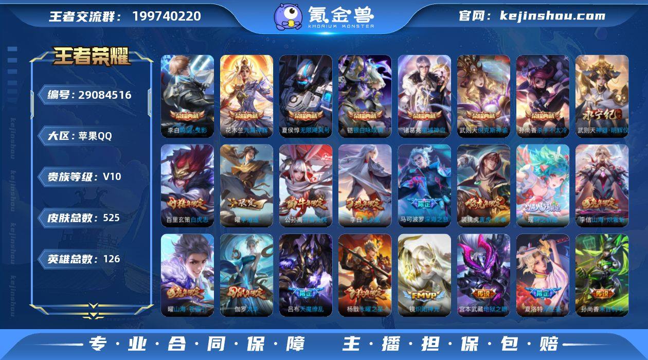 实名: 可修改 贵族等级: V10 英雄数: 126 皮肤数: 525 荣耀水晶: 武则天,倪克斯神谕,无限飓风号,杀手不太冷,鸣剑·曳影,星域神启,九霄神辉,银白咏叹调 无双皮: 神器·明辉仪 传说皮: 黄金狮子座,黄金射手座,冠军飞将,云鹰飞将,绛天战甲,黄金白羊座,猫影幻舞,久胜战神,炽阳神光,一念神魔,云霓雀翎,末日机甲-孙尚香,地狱火,仲夏夜之梦,音你心动-小乔,零号·赤焰,海洋之心,地狱之眼,飞鸢探春,音你心动-周瑜,胖达荣荣,李逍遥,乞巧织情,时之恋人-刘备,游龙清影,淬星耀世,超时空战士-狄仁杰,遇见胡旋,末日机甲-孙策,花朝如约,挚爱之约,挚爱花嫁,无双飞将,音你闪耀,碎云,神器·狴犴令,神器·明辉仪,山海·炽霜斩,山海·琳琅生,山海·苍雷引,炽翼辉光,燃星之曲,画中仙,浮生妄,记忆之芯,百相守梦(张飞),追逃游戏(亚瑟),艾琳觅芳踪,启明星使,幻光神枪 限定皮: 冰锋战神,遇见飞天,李小龙,奔雷神使,祈雪灵祝,游园惊梦,梁祝,御风骁将,云端筑梦师,时雨天司,龙胆,白鹤梁神女,武圣,烈魂,魔法小厨娘,辉光之辰,异界灵契-孙尚香,玄嵩,白晶晶,岱宗,天狼溯光者,虎魄,天魔缭乱,神威,永曜之星,幽恒,时之彼端,奇迹圣诞,飞衡,太华,天狼征服者,青春决赛季,逐梦之翼,天狼狩猎者,天狼运算者,逐梦之星,逐梦之影,热情桑巴,神奇女侠,天狼绘梦者,凤求凰,寅虎·御盾,白虎志,青龙志,瑞麟志,玄武志,朱雀志,凤凰于飞,如梦令-嫦娥,纯白花嫁,至尊宝,默契交锋-兰陵王,真爱至上,一生所爱,武陵仙君,如梦令-后羿,大圣娶亲,默契交锋-花木兰,寅虎·瑞焰,霸王别姬-项羽,霸王别姬-虞姬,高山流水,孙行者,猪悟能,匿光追影者,女儿国国王,傲雪梅枪,寅虎·赤拳,寅虎·心曲,寅虎·展翼,时之祈愿-云中君,时之祈愿-瑶,补天,百木心枪,玉兔公主,启示之音,匿光决锋者,无尽星芒,深海之息,唐三藏,前尘镜,枫霜尽,匿光启智者,时之奇旅-妲己,星穹之声,五谷丰年,绯月行,神器·万象笔,梦圆繁星,诗...