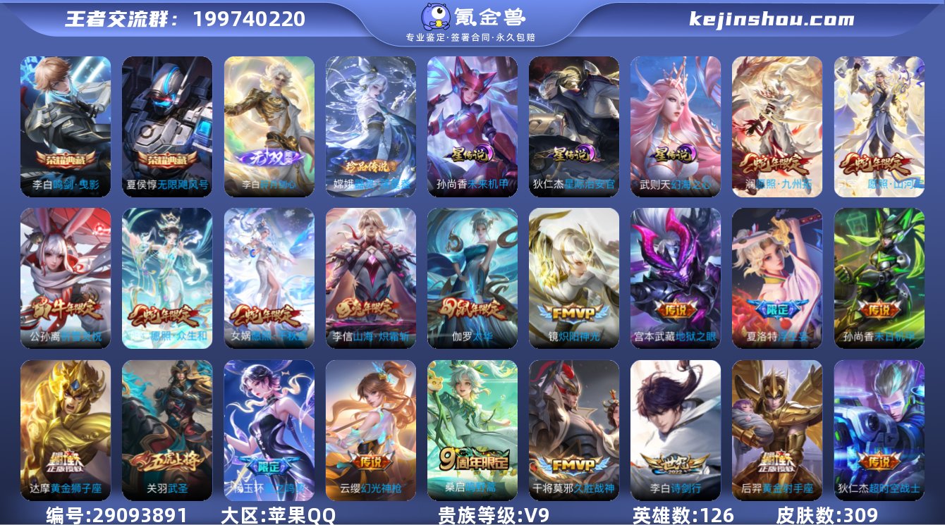 苹果Q v9 397皮 43传说1无双1典藏 7金标(星传说:幻海之星-星际治安官-未来机甲)实名: 可修改 贵族等级: V9 英雄数: 126 皮肤数: 309 荣耀水晶: 武则天,无限飓风号,鸣剑·曳影 无双皮: 碎月剑心 珍品传说: 器灵·落星盏 星传说: 幻海之心,未来机甲,星际治安官 传说皮: 黄金狮子座,黄金射手座,绛天战甲,久胜战神,炽阳神光,云霓雀翎,末日机甲-孙尚香,音你心动-小乔,海洋之心,地狱之眼,飞鸢探春,音你心动-周瑜,乞巧织情,超时空战士-狄仁杰,碎云,山海·炽霜斩,浮生妄,幻光神枪,星之鸣奏 限定皮: 冰锋战神,李小龙,祈雪灵祝,梁祝,武圣,太华,逐梦之音,大圣娶亲,五谷丰年,诗剑行,山海·玄木吟,鸣野蒿,愿照·千秋盛,愿照·众生和,愿照·山河定,愿照·九州拓