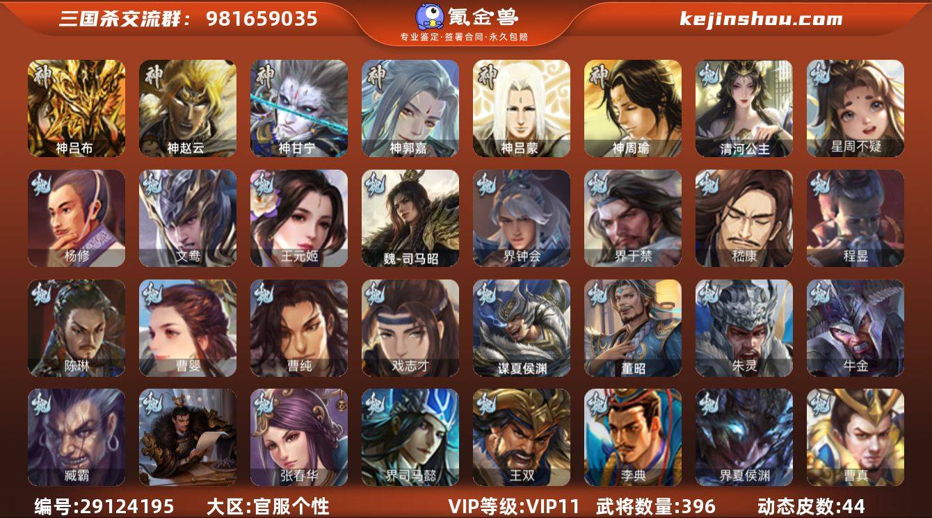 VIP等级: VIP11 官阶: 大将军 武将数量: 396 动态皮肤数量: 44 神将: 神甘宁,神郭嘉,神吕布,神赵云,神吕蒙,神周瑜 魏国武将: 戏志才,曹纯,曹婴,陈琳,程昱,嵇康,界于禁,界钟会,魏-司马昭,王元姬,文鸯,杨修,唐咨-魏,张辽,SP蔡文姬,SP关羽,SP贾诩,SP姜维,SP庞德,卞夫人,蔡贞姬,曹昂,曹操,曹冲,曹洪,曹丕,曹仁,曹叡,王异,张恭,鲁芝,界满宠,曹休,界曹植,满宠,荀攸,王基,钟繇,蒯越蒯良,郭嘉,牵招,荀彧,杜畿,界郭嘉,崔琰,界曹丕,界荀彧,朱灵,界甄姬,吕虔,界王异,界许褚,界郭淮,华歆,陈群,界邓艾,界典韦,界曹休,袁涣,李通,乐进,辛宪英,郭淮,毛玠,郭皇后,毌丘俭,夏侯惇,曹植,司马朗,谋于禁,界曹操,星周不疑,许褚,界张辽,谋徐晃,张郃,钟会,文聘,曹彰,界夏侯惇,诸葛诞,司马懿,甄姬,界徐晃,徐晃,孙资刘放,韩浩史涣,胡班,曹真,典韦,界夏侯渊,夏侯渊,李典,于禁,王双,邓艾,界司马懿,张春华,孟达-魏,臧霸,牛金,朱灵(国战),清河公主,董昭,谋夏侯渊 蜀国武将: 董允,花鬘,界黄忠,谯周,沙摩柯,王平,张星彩,诸葛瞻,谋赵云,马云騄,徐庶,杨仪,吕凯,界关羽,界诸葛亮,邓芝,界伊籍,胡金定,费祎,严颜,界黄月英,界张嶷,赵云,张松,彭羕,李丰,界刘备,界刘禅,谋姜维,刘封,糜竺,谋庞统,黄月英,刘巴,关羽,王甫赵累,吴懿,吴班,祝融,张飞,黄皓,陈震,魏延,界周仓,马忠,界法正,糜夫人,界孟获,刘禅,界赵云,界姜维,关银屏,界祝融,SP孙尚香,SP徐庶,卧龙诸葛,宗预,周仓,简雍,界关兴张苞,诸葛亮,孙乾,界张飞,界卧龙诸葛,法正,赵统赵广,陈到,界马岱,关平,马岱,界庞统,庞统,诸葛果,谋张飞,马谡,马超,霍峻,廖化,关兴张苞,孟获,夏侯氏,姜维,黄忠,刘备,界马超,李严,马良,傅肜,蒋琬费祎,刘谌,彭羕(国战),甘夫人,蜀-糜芳傅士仁,SP甘夫人 吴国武将: 贺齐,界徐盛,留赞,吴景,周处,文鸯,潘濬,张温,周泰,全琮,吕蒙,诸葛恪,界孙尚香,界顾雍,大乔小乔,桥公,谋周瑜,许贡,丁奉...