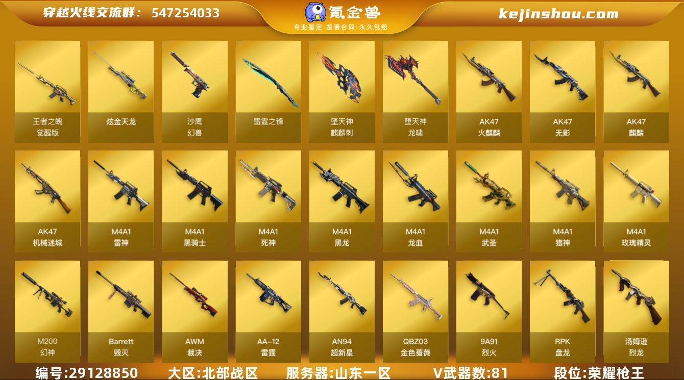 ★可协助解人脸★ 山东一区83V2王者1炫金可排位/M200幻神+尼泊尔-雷霆+1套雷霆雷/4把QBZ03-金色蔷薇/1盘龙2炼狱2烈龙+死亡之眼/5麒麟刺/黑骑士音效卡/毁灭音效卡/火麒麟CFS2018/黑骑士战神马超/雷神海滩派对/天龙传奇白鲨/天龙传奇70KG/火麒麟AG战队/毁灭冠军之怒/火麒麟冠军之心/修罗冠军之魂/毁灭荣耀之怒/雷神-白鲨-CFPLS14冠军/炼狱星空/激光毁灭者3/乱世超越4/王者之魄觉醒/炫金天龙/武圣/4毁灭/2屠龙/迷迭香/奇洋探员/王者零/魅影/战舰头盔/战舰护目镜/炫彩背包/超级背包3-7/永久防弹衣+永久防弹头盔+永久C4工具钳+永久手雷包/28赛季枪王4/详情看图★星迈游★低价出售找回包赔