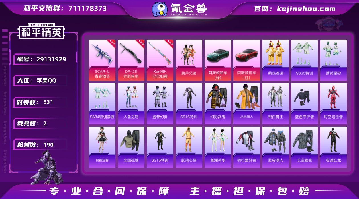 热力值:58943 载具数:2 时装数:531 战备数:126 王牌印记:6 葫芦兄弟 七级SCAR-L-青春物语,五级DP-28-豹影疾电,五级Kar98K-巳巳如意 阿斯顿·马丁DBS(红),阿斯顿·马丁DBS(绿) 梦幻火箭飞行器,闪光银龙飞行器,彩虹独角兽降落伞,四圣焕新降落伞,香水柠檬降落伞,炫紫旋律降落伞,银刃赛罗降落伞 萌鸡速递,SS35特训,薄荷星砂,SS34特训套装,艾克斯奥特曼,冰川格斗者,冰川特警,缤纷果语,暴风机械师,北国孤狼,滨海厨神,薄荷蓝莓,白糯汤圆,冰原使者,长空猛禽,丛林猎人,潮流游乐家,传奇侦探,炽焰拳师,大橘为重,都市魅力,飞驰魅影,疯狂小兔子,福星高照,格斗先锋,格斗专家,贵族骑装,虎虎生威吉莉,红酒骑士,海琴烟,灰色格斗者,海上生明月,幻世战舞者,幻影武者,军刀雅典娜,娇憨猪猪,竞技达人朋克,竞技名士,竞技勇士朋克,吉莉礼服,坚韧舞者,极速红龙,精神漫游,金鼠迎春,街头潮人,金耀舞者,酷潮明星,科技之星,空投萌叽,蓝彩潮人,龙的传人,凛冬战士,黎明保卫者,浪漫樱花,蓝色守护者,抹茶蜜豆,猛禽,萌黄之夏,魅力单车,麻辣教官,萌趣咩咩,萌趣颜团子,墨染幽兰,迷域探索者,逆风勇士,霓虹极客,霓虹街区,怒火燎原,牛气冲天,牛气满满,暖心橘喵,破蛋小黄鸡,朋克治安官,破晓战魂,青春冒险家,拳皇97八神庵,青龙圣者,绮丽涂鸦,骑行爱好者,清香五月粽,瑞龙福将,人气偶像,人鱼之吻,圣诞大吉,时空追击者,沙漠兵团,沙漠毒蛇,SS11特训,SS12特训,SS13特训,SS14特训,SS15特训,SS16特训,SS17特训,SS18特训,SS19特训,SS20特训,SS21特训,SS25特训,SS31特训套装,SS32特训套装,SS33特训套装,SS5特训,SS6特训,SS7特训,SS8特训,SS9特训,巳巳如意,甜蜜告白,特训学院,甜心亚梦,团圆交子,特种颜团子,特战装甲,完美偶像,炫蓝之夏,星梦畅游,雪山精英,雪山征服者,雪兔飞飞,核芯基因,香榭午后,虚音幻奏,银白舞王,原初圣火,异彩先驱,跃动心情,耀粉歌者,音速流光,玉兔迎春,鱼渊荷华,燕燕于飞,战地督导,战地菁英,智慧之神,智谋强哥,治愈之星 AKM-霓彩脉冲,Famas-霓彩脉冲,SLR-霓彩脉冲,破片手榴弹-拽到爆炸,S12K-霓彩脉冲,AC-VAL-天降萌叽,AC-VAL-甜心亚梦,AKM-春暖花开,AKM-虎虎生威,AKM-龙的传人,AKM-萌趣颜团子,AKM-破晓战魂,AKM-夜灯,AKM-玉龙,AKS-74U-鸡智如我,AUG-青春冒险家,AUG-天降萌叽,AUG-耀粉歌者,AWM-恐龙拽拽,DBS-时空追击者,DBS-甜心亚梦,DP-28-锦绣火鲤,DP-28-甜心亚梦,DP-28-原初圣火,G36C-暗夜玫瑰,G36C-时空追击者,GROZA-黑色刀锋,GROZA-异彩先驱,GROZA-治愈之星,Kar98K-2B战斗服款,Kar98K-彩虹符号,Kar98K-飞驰魅影,Kar98K-欢乐麻酱,Kar98K-红色方程式,Kar98K-炫彩节奏,Kar98K-勇闯险境,M16A4-冰河战士,M16A4-幻世战舞者,M16A4-凝视深渊,M16A4-甜心亚梦,M16A4-夜灯,M200-乌木金纹,M249-金丰海韵,M249-镭射皇者,M249-破晓战魂,M249-拳皇97,M249-四圣焕新,M249-无面战甲,M24-冰封烈焰,M24-香水柠檬,M24-众神之王,M24-治愈之星,M416-绯红前夜,M416-红色方程式,M416-蓝色火焰,M416