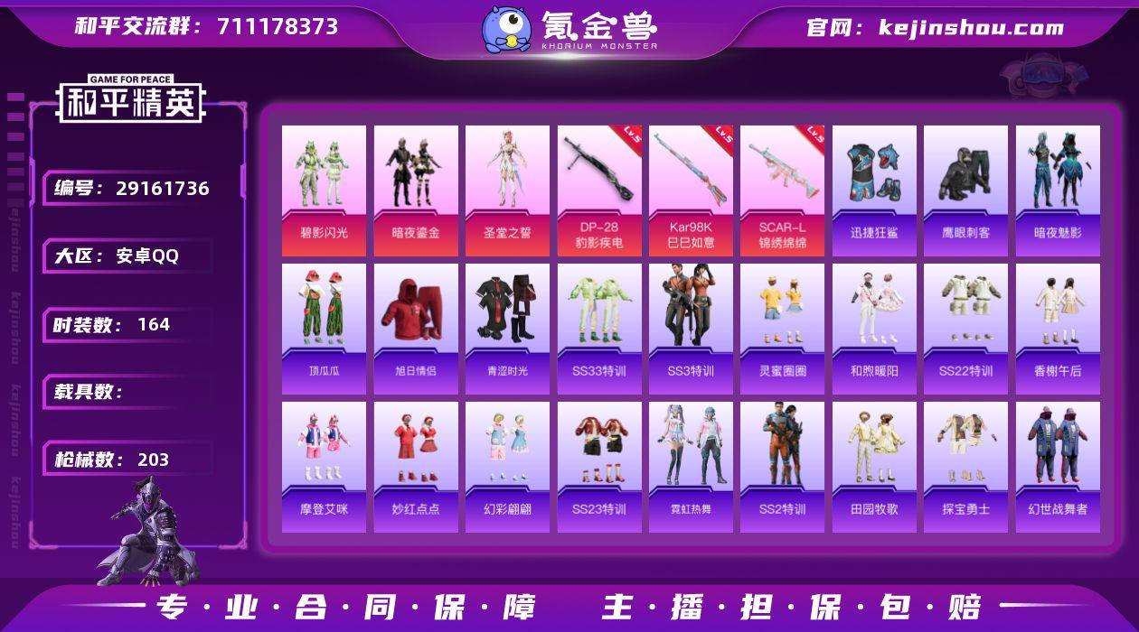 HX0916无二次 安卓Q-段位黄金 8印记 164套装203枪皮 【3粉装】 角色-圣堂之誓 暗夜鎏金 碧影闪光 【3特效】 SCAR-L-锦绣绵绵 5级 DP-28-豹影疾电 5级 Kar98K-巳巳如意 5级 【1飞行器】 齐天大圣飞行器 【热门】 迅捷狂鲨 锦衣飞扬 飞驰魅影 雪山精英 恶魔宝贝 清新柠檬 夜莺强袭者