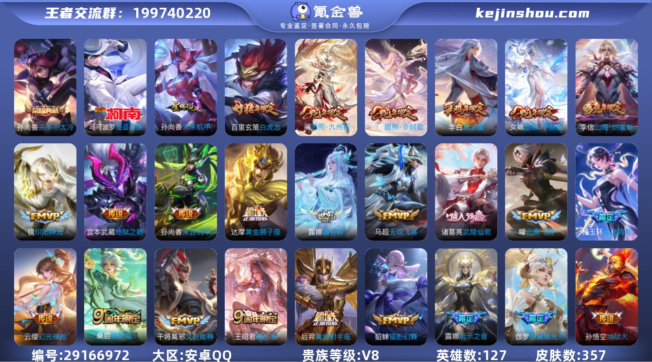 贵族等级:V8 典藏皮肤数:1 珍品无双皮肤数:0 无双皮肤数:0 珍品传说皮肤数:1 传说皮肤数:25 史诗皮肤数:89 皮肤数:357 英雄数:127 段位:非凡王者
