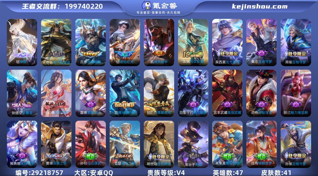 贵族等级:V4 典藏皮肤数:0 珍品无双皮肤数:0 无双皮肤数:1 珍品传说皮肤数:0 传说皮肤数:3 史诗皮肤数:13 皮肤数:41 英雄数:47 段位:非凡王者 卖家说:全皮大司命最高85星凯无双
