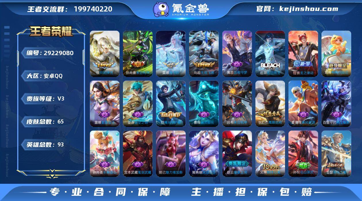 实名: 可修改 贵族等级: V3 英雄数: 93 皮肤数: 65 传说皮: 炽阳神光,末日机甲-孙尚香,无双飞将,霜月吟,神树通天