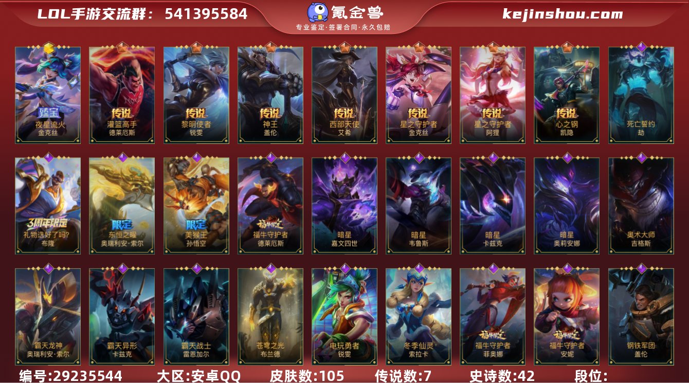 皮肤数:105 典藏皮肤数量:0 神话皮肤数量:1 传说皮肤数量:7 史诗皮肤数量:42