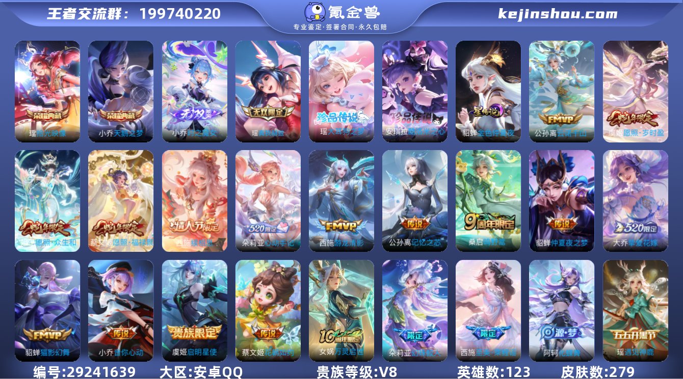 贵族等级:V8 典藏皮肤数:2 珍品无双皮肤数:0 无双皮肤数:2 珍品传说皮肤数:2 传说皮肤数:15 史诗皮肤数:67 皮肤数:279 英雄数:123 段位:王者 卖家说:一手公主号