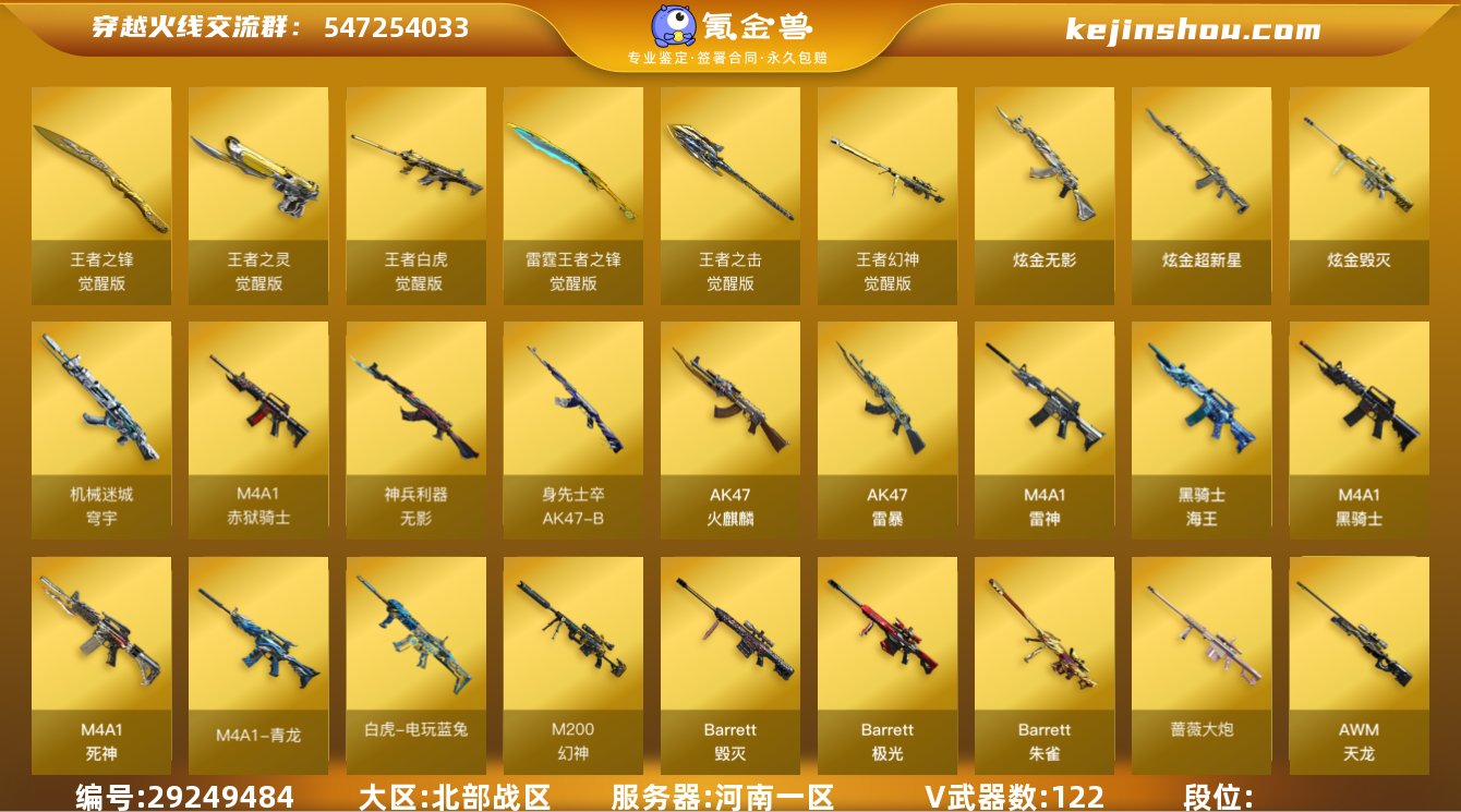 VIP等级:VIP6 V武器数:122 王者之锋-觉醒版,王者之灵-觉醒版,王者白虎-觉醒版,雷霆王者之锋-觉醒版,王者之击-觉醒版,王者幻神-觉醒版 炫金无影,炫金超新星,炫金毁灭 机械迷城-穹宇,M4A1-赤狱骑士,无影-神兵利器,AK47-B-身先士卒,AK47-火麒麟,AK47-雷暴,M4A1-雷神,黑骑士-海王,M4A1-黑骑士,M4A1-死神,M4A1-青龙,白虎-电玩蓝兔,M200-幻神,Barrett-毁灭,Barrett-极光,Barrett-朱雀,蔷薇大炮,AWM-天龙,AWM-裁决,Kar98k-星神,AK12-天启,AN94-超新星,QBZ03-金色蔷薇,9A91-烈火,加特林-炼狱,沙鹰-修罗,屠龙,龙啸,麒麟刺,柯尔特-荣耀世冠,USP-雷暴,擎天-竞技荣光,龙啸-荣耀世冠,AK47-B-常胜将军,斩神刀-雷暴,AK47-B-战士,AK47-B-战神,AK-47-猩红传说,烈龙,M14EBR-玄武,雷神-荣耀世冠,龙啸-烈火龙威,烈火-动感闪耀,天神-动感闪耀,屠龙-动感闪耀,Barrett-碧霄极光 春,电竞教官-云悠悠,零·纪元,零-热舞青春,魅影,炫,樱,雨棠,战地猎狐,职业选手 M4A1-黑骑士音效卡,M4A1-雷神音效卡,AK47-火麒麟音效卡 卖家说:CEWGC1160,内容:500级荣誉元帅,枪王之王名片,幻神俩皮肤,8白虎,7套粉烟,7套雷暴7套雷霆王者生化角色刷好了,全模式都能玩,猫买的卖过保先了,绝对安全。