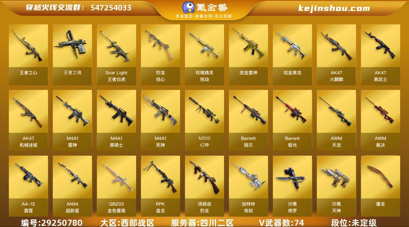 四川二区-79V-24王者-2炫金 【热门武器】:王者白虎,QBZ03-金色蔷薇,M200-幻神,死亡之眼*5,荣耀世冠-柯尔特,C.A.T,M4A1-黑骑士*2,汤姆逊-烈龙*6,RPK-盘龙*6,加特林-炼狱,羊驼玩偶,沙鹰-修罗*6,金刚伞 【王者炫金武器】:玫瑰精灵-悦动,王者之心,王者白虎,烈龙-悦心,王者之魂*2,炫金黑龙,炫金雷神 【音效卡】:M200-幻神音效卡,M4A1-黑骑士音效卡,Barrett-毁灭音效卡 【稀有皮肤】:雷神-能量核心*2,火麒麟-冠军之心,火麒麟-平天大圣,火麒麟-荣耀世冠AG,毁灭耀金皮肤,毁灭-冠军之怒,AWM-天龙-传奇70KG,AWM-天龙-传奇白鲨,屠龙-荣耀之锋 【角色】:零,葵,樱,魅影,王者-葵-貂蝉,王者-零,王者-迷迭香,王者玲珑-小乔,蜀雪,铁骑荣耀 【人偶武器】:M4A1-雷神-精英刀锋,COP-旗袍,C.A.T,迷你艾比,迷你裂空之翼*4,夺魂,闪光弹-小乔,闪光弹-貂蝉,高爆手雷-大乔 【暴走生化】:死亡之眼*5,黑龙吞噬者,超级对讲机 【挑战大师】:神圣爆裂者III,机甲撕裂者III,阐释者III,激光毁灭者III,VEPR-12-金魔,激光毁灭者III-白马银枪,冰龙粉碎者-白马银枪,暴君乱世-超越Max 【英雄级武器】:AK47-火麒麟,M4A1-雷神*2,M4A1-黑骑士*2,M4A1-死神*2,AK47-黑武士,AN94-超新星,AK47-机械迷城,QBZ03-金色蔷薇,AK-47-猩红传说*6,AK47-B-战神,AK47-B-常胜将军,AWM-天龙*2,Barrett-毁灭*2,Barrett-极光,AWM-裁决,M200-幻神,RPK-盘龙*6,加特林-炼狱,汤姆逊-烈龙*6,AA-12-雷霆,沙鹰-修罗*6,沙鹰-天神,荣耀世冠-柯尔特,屠龙*6,龙啸,擎天,麒麟刺,幻灵之锋 【特殊枪械】:2黑骑士,6烈龙,6盘龙,1炼狱