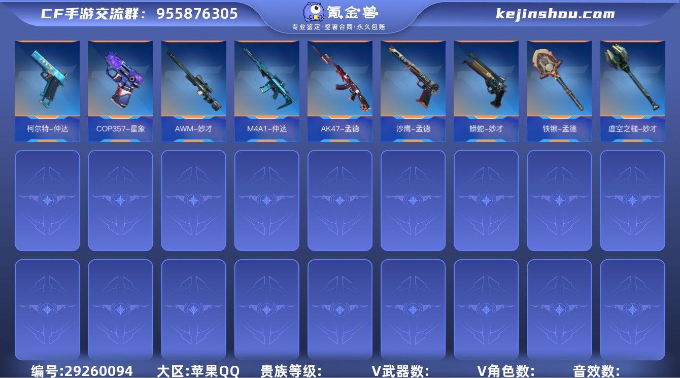 【FC-4Rrl8B】苹果QQ,军衔描述:荣耀元首,成人号:是,角色等级:183,实名:有修改人脸机会/实名是本人,段位:枪皇SSS,VIP等级:V9,V武器数量:398,V角色数量:15,V总数量:272,王者武器数:25,万化数量:535, 【人物角色】关小雨,香香,樱,幽灵刀锋-觉醒,大老师,萝拉,零,审判者,曼陀罗,白狼,潘多拉,奥摩,斯沃特,炽天使-X,云悠悠-心动起点,雅典娜,职场灵狐-赛事经理,春,斯薇特, 【王者武器】蝴蝶刀-天神,王者之心手雷,王者之影手雷,王者之圣手雷,王者之心烟雾弹,王者之心闪光弹,王者之翼闪光弹,王者之影闪光弹,王者之圣闪光弹,王者之影烟雾弹,王者之圣烟雾弹,王者之心,王者之影,王者之魄,王者之怒,王者之魂,王者之灵,王者之锋,王者之啸,王者之击,王者之烈,王者之迹,王者之痕,王者之城,王者之神, 【至尊套装】影至尊,怒至尊,心至尊,魄至尊, 【带V枪械】AWM-天龙-魔神,王者之痕-冰霜奇迹,M200-幻神-战舞,加特林-炼狱-怒魔,王者之心闪光弹-HeartShot,MK5-机械纪元-蚀刻战甲,王者之心烟雾弹-HeartShot,双持斯泰尔-天使-血翼,G36-机械纪元,M4A1-冰锋觉醒,M4A1-海骑士,M4A1-赛博雷神,KSG-天蓬元帅-千变,M4A1-机械迷城,M4A1-仲达,M4A1-龙血,M4A1-雷神-萝拉,M4A1-星象,沙鹰-火麒麟-Pro Max,M4A1-君威GS,M4A1-沙漠领主,M4A1-游骑兵,M4A1-玫瑰精灵,M4A1-死神,M4A1-黑龙,M4A1-黑骑士,M4A1-雷神,沙鹰-修罗-暗月,MK47-云舞,气手枪-炼狱-怒魔,MK47-仁德,AK47-波塞冬,AK47-血武士,AK47-雷麒麟,消音毛瑟-常胜-铩魔,AK47-心动次元觉醒,AK47-猩红传说,AK47-幸运日觉醒,AK47-机械迷城,AK47-樱斗士-一觉,AK47-无影-葵,AK47-常胜,M4A1-游骑兵-寒霜,AK47-冰魂觉醒,AK47-角斗士,AK47-牡丹精灵,AK47-沙漠领主,M4A1-黑骑士-瑞兽,AK47-黑武...