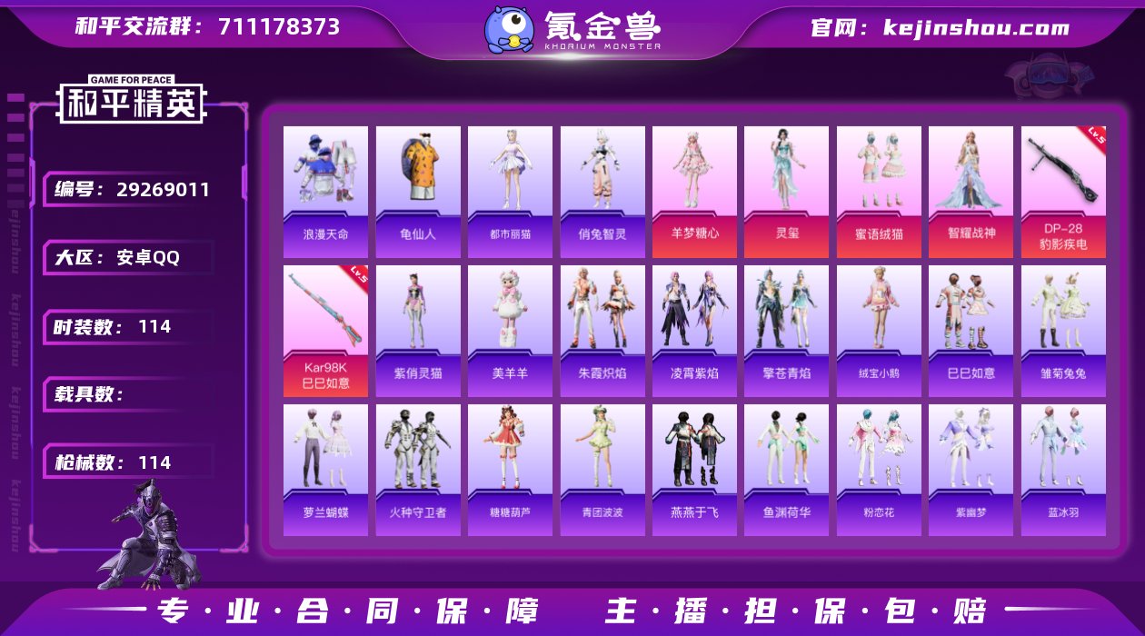安卓 手Q-4粉装-2特效枪-0载具-0粉色飞行器-37122热力值-1王牌印记-114套装-114枪皮 【热门品类】:套装-浪漫天命,套装-深海小丑鱼,套装-龟仙人 【粉色套装】:粉装-蜜语绒猫,角色-智耀战神,角色-灵玺,角色-羊梦糖心 【粉色枪皮等级】:Kar98K-巳巳如意(五级),DP-28-豹影疾电(五级) 【粉色枪皮】:Kar98K-巳巳如意,DP-28-豹影疾电 【粉色降落伞】:春暖花开降落伞,超新星降落伞,江南烟雨降落伞,精灵梦叶罗丽降落伞,金丰海韵降落伞,拳皇·狂花道降落伞,未来领航者降落伞,千金淑猫降落伞,智耀战神降落伞,星穹咏叹调降落伞,荧海星豚降落伞,无垠阁降落伞,喜羊羊与灰太狼降落伞 【稀有套装】:套装-龟仙人,套装-绒宝小鹅,套装-巳巳如意,套装-雏菊兔兔,套装-萝兰蝴蝶,套装-火种守卫者,套装-糖糖葫芦,套装-青团波波,角色-都市丽猫,角色-俏兔智灵,套装-燕燕于飞,套装-鱼渊荷华,套装-粉恋花,套装-紫幽梦,套装-蓝冰羽,套装-星影赞美诗,套装-霓虹热舞,套装-彩虹兔,套装-云朵鹅,套装-雪绒豹,套装-蓝海鲸歌,套装-朱霞炽焰,套装-凌霄紫焰,套装-擎苍青焰,玩偶服-美羊羊,角色-紫俏灵猫 【稀有枪皮】:AKM-江南烟雨,M416-糯团青竹,GROZA-荧海星豚,M762-云朵鹅,G36C-星穹咏叹调,蜜獾-天降萌叽,ARX-凌霄紫焰,UZI-天降萌叽,UMP45-绒宝小鹅,汤姆逊-天降萌叽,汤姆逊-炫彩节奏,汤姆逊-智耀战神,JS9-凌霄紫焰,P90-巳巳如意,Kar98K-彩虹符号,Kar98K-星穹咏叹调,SVD-云朵鹅,S686-生命誓言,S686-巳巳如意,S686-千金淑猫,S1897-荧海星豚,DBS-荧海星豚,DBS-幻彩电音,SPAS-12-云朵鹅,DP-28-彩虹符号,MG-36-凌霄紫焰,P92-凌霄紫焰,短管霰弹-星穹咏叹调,蝎式手枪-千金淑猫,沙漠之鹰-云朵鹅,TMP-9-萌萌史莱姆,大砍刀-云朵鹅,平底锅-凌霄紫焰,破片手榴弹-巳巳如意 【其...
