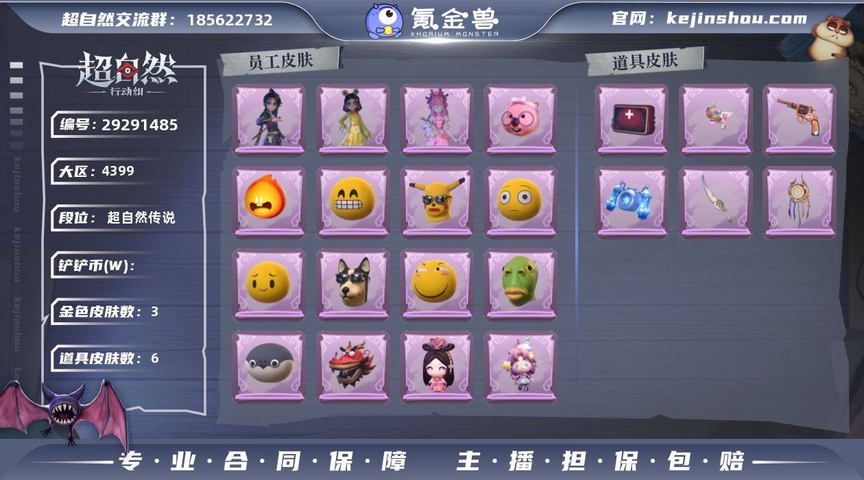 金色皮肤数量:3 紫色皮肤数量:25 道具皮肤数量:6 卖家说:急出