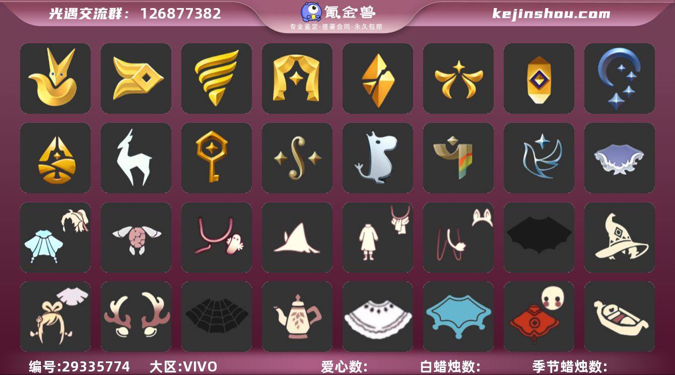 9季10翼星球夹克暖冬瑞雪蝙蝠斗阿努比斯TGC斗篷王子围巾 资源:蜡烛236 爱心40 红烛17 翼10 已毕业地图:全图毕业 毕业季节:圣岛季 预言季 梦想季 集结季 小王子季 风行季 半表演季 欧若拉季季卡 九色鹿季季卡 毕业季节物品: 毕业手碟 遥鲲斗篷 手拍大鼓 阿努比斯 凤凰面具 凤凰斗篷 队长面具 双耳锅帽 胜利号角 连帽斗篷 小王子发型 小王子套装 玫瑰花 多羽发饰 蓝黄羽袖 稀有礼包:大桔大利 圣诞鹿角 TGC斗篷 王子围巾 星球夹克 暖冬瑞雪 蝙蝠斗 秋千 热门裤子:背带裤 绑带舞服 白棉裤 搓澡巾 紧身连体衣 武士裤 小王子服 羽袖长袍 热门面具:矮人面具 狐狸面具 黄鼠狼面具 阿努比斯 红兔面具 凤凰面具 黄眉面具 一字眉 红脸蛋面具 玫瑰花面具 黑脸 热门发型:海藻头 爆炸头 大胡子 小飞象 雨妈 卡卡 平菇 指甲盖 箬笠 蝴蝶结 公主头 粗辫 水母头 书虫 总裁头 正太 高马尾 斗笠 绿丝带 小王子头 圆环发辫 留辫蘑菇头 春丽丸子头 温暖绒帽 猫猫头 女巫发型 是都没 绊爱发型 光头 热门头饰:多羽发饰 大桔大利 花环 晃悠悠 红耳机 圣诞鹿角 热门斗篷:TGC斗篷 花瓣斗篷 红金斗篷 黑金斗篷 白金斗篷 蝴蝶斗篷 鳐鲲斗蓬 蝴蝶斗篷 飞号的票 连帽斗篷 王子围巾 星球夹克 展翼圆环斗 透明蝶翼 新年福娃斗篷 樱花斗篷 绿芽 海洋斗篷 漩涡斗篷 彩虹斗篷 蝙蝠斗 暖冬瑞雪 绊爱斗篷 粽叶斗篷 热门背饰:号角 手碟 毕业大鼓 小号 相机 椅子 吊床 齐全 星星灯 秋千 女巫茶桌 圣诞节椅子 玫瑰花 "