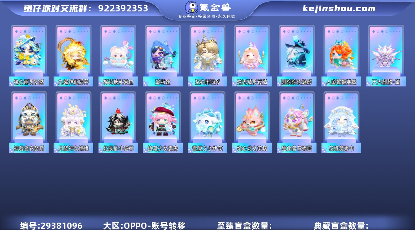 绘心画灵安然,九曜神返后羿,北辰星斗破军,独角兽芬妮亚,花嫁薇妮卡,剧院院长魅影,棉花糖芙米拉,人鱼歌姬赛然,神裁者安努斯,鲨莉娃,圣约奥西多,天火麒麟-堇,焰心龙女芙瑞,雪原之心伊芙,月族神女嫦娥,执笔少女露离,烛光精灵夜清 段位:四阶鹅蛋 卖家说:等级63级,历史排名凤凰三万名,十三个凤凰印记,历史总潮流度17.2万,氪条90410,17个至臻其中两个隐藏款,56个至臻配饰有翅膀青鸾仙羽,97个典藏,有星河弹弹车,云梦兜兜龙,扶光妙妙鲤,以及热气球·云端之约,载具金色染色剂一个