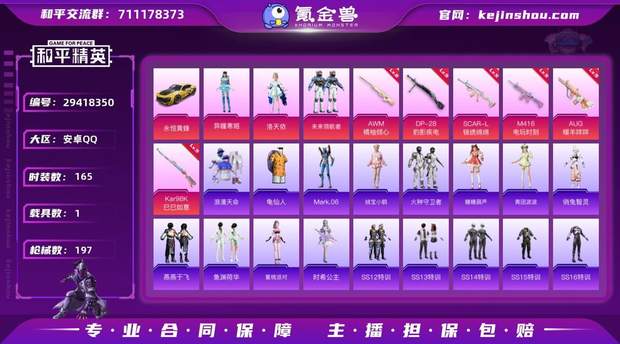 安卓 手Q-3粉装-6特效枪-1载具-3粉色飞行器-61052热力值-13王牌印记-165套装-197枪皮 【热门品类】:套装-浪漫天命,套装-龟仙人,角色-Mark.06 【粉色载具】:永恒黄蜂 【粉色套装】:角色-洛天依,粉装-未来领航者,角色-异瞳寒姬 【粉色枪皮等级】:SCAR-L-锦绣绵绵(五级),M416-电玩时刻(五级),AUG-暖羊咩咩(五级),Kar98K-巳巳如意(五级),AWM-橘柚倾心(六级),DP-28-豹影疾电(五级) 【粉色枪皮】:SCAR-L-锦绣绵绵,M416-电玩时刻,AUG-暖羊咩咩,Kar98K-巳巳如意,AWM-橘柚倾心,DP-28-豹影疾电 【粉色飞行器】:齐天大圣飞行器,镜光幻境飞行翼,星空武士飞行器 【粉色降落伞】:星之彼岸降落伞,环太平洋降落伞,垂柳戏鸭降落伞,彩虹甜喵降落伞,圣堂之誓降落伞,沙丘之主降落伞,精灵梦叶罗丽降落伞,墨龙九天降落伞,初号机 觉醒Ver.降落伞,千金淑猫降落伞,幻彩电音降落伞 【稀有套装】:套装-龟仙人,套装-绒宝小鹅,套装-火种守卫者,套装-糖糖葫芦,套装-青团波波,角色-俏兔智灵,套装-燕燕于飞,套装-鱼渊荷华,角色-蜜桃派对,角色-时希公主 【稀有枪皮】:AKM-2P战斗服款,AKM-冰凉西瓜,AKM-夜灯,AKM-灼热熔岩,AKM-生命誓言,AKM-破晓战魂,AKM-萌趣颜团子,AKM-虎虎生威,AKM-霓虹街区,AKM-龙的传人,M16A4-夜灯,M16A4-幻世战舞者,M16A4-千金淑猫,SCAR-L-夜灯,SCAR-L-炫彩节奏,SCAR-L-玉兔迎春,SCAR-L-红色方程式,M416-摩登王国,M416-暗夜行者,M416-糯团青竹,M416-红色方程式,M416-绯红前夜,M416-蓝色火焰,GROZA-彩虹符号,GROZA-影袭,GROZA-治愈之星,GROZA-田园牧歌,AUG-天降萌叽,AUG-耀粉歌者,AUG-闲梦青缨,QBZ-原初圣火,QBZ-彩虹符号,QBZ-未来歌姬,QBZ-飞驰魅影,M762-天降萌叽,M762-彩虹甜喵,M762-牛气冲天,M762-瑞龙福将,M762-绯红前夜,AC-VAL-天降萌...