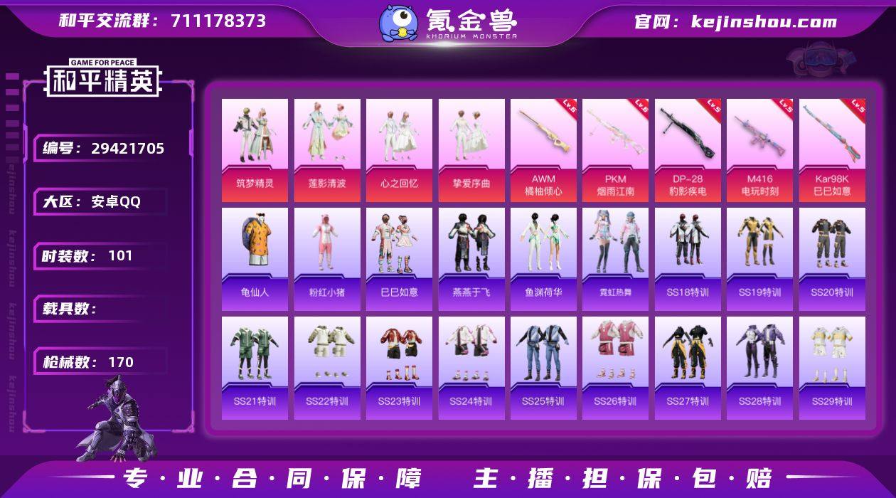 安卓 手Q-4粉装-5特效枪-0载具-0粉色飞行器-45667热力值-8王牌印记-101套装-170枪皮 【热门品类】:套装-深海小丑鱼,套装-龟仙人,套装-粉红小猪 【粉色套装】:粉装-筑梦精灵,粉装-心之回忆,粉装-挚爱序曲,粉装-莲影清波 【粉色枪皮等级】:M416-电玩时刻(五级),Kar98K-巳巳如意(五级),AWM-橘柚倾心(六级),DP-28-豹影疾电(五级),PKM-江南烟雨(六级) 【粉色枪皮】:M416-电玩时刻,Kar98K-巳巳如意,AWM-橘柚倾心,DP-28-豹影疾电,PKM-江南烟雨 【粉色降落伞】:筑梦精灵降落伞,垂柳戏鸭降落伞,闲梦青缨降落伞 【稀有套装】:套装-龟仙人,套装-巳巳如意,套装-燕燕于飞,套装-鱼渊荷华,套装-霓虹热舞 【稀有枪皮】:AKM-彩虹符号,AKM-灼热熔岩,AKM-破晓战魂,AKM-筑梦精灵,AKM-霓虹街区,AKM-龙的传人,M16A4-幻世战舞者,M16A4-甜心亚梦,M16A4-红色方程式,M16A4-蓝色火焰,SCAR-L-夜灯,SCAR-L-炫彩节奏,SCAR-L-玉兔迎春,SCAR-L-粉色回忆,SCAR-L-红色方程式,M416-神秘黑猫,M416-糯团青竹,M416-红色方程式,M416-绯红前夜,M416-蓝色火焰,GROZA-彩虹符号,GROZA-懵萌河马,GROZA-田园牧歌,AUG-流星咚咚,AUG-耀粉歌者,AUG-闲梦青缨,QBZ-彩虹符号,M762-天降萌叽,M762-彩虹符号,Mk47-妙红点点,G36C-懵萌河马,G36C-暗夜玫瑰,AC-VAL-天降萌叽,AC-VAL-甜心亚梦,AC-VAL-魅影蝠王,蜜獾-天降萌叽,蜜獾-娇憨猪猪,UZI-啾咪啾咪,UZI-天降萌叽,UZI-娇憨猪猪,UZI-红色方程式,UMP45-春暖花开,UMP45-涂山之恋,UMP45-灵符少年,UMP45-蓝色火焰,Vector-焰鹰斗篷,Vector-生命誓言,Vector-田园牧歌,汤姆逊-天降萌叽,汤姆逊-暗夜鎏金,汤姆逊-炫彩节奏,汤姆逊-环太平洋,汤姆逊-耀粉歌者,P90-甜蜜旋律,P90-筑梦精灵,P90-巳巳如意,Kar98K-王子的夏天,Kar98K-红色方程式,M24-...