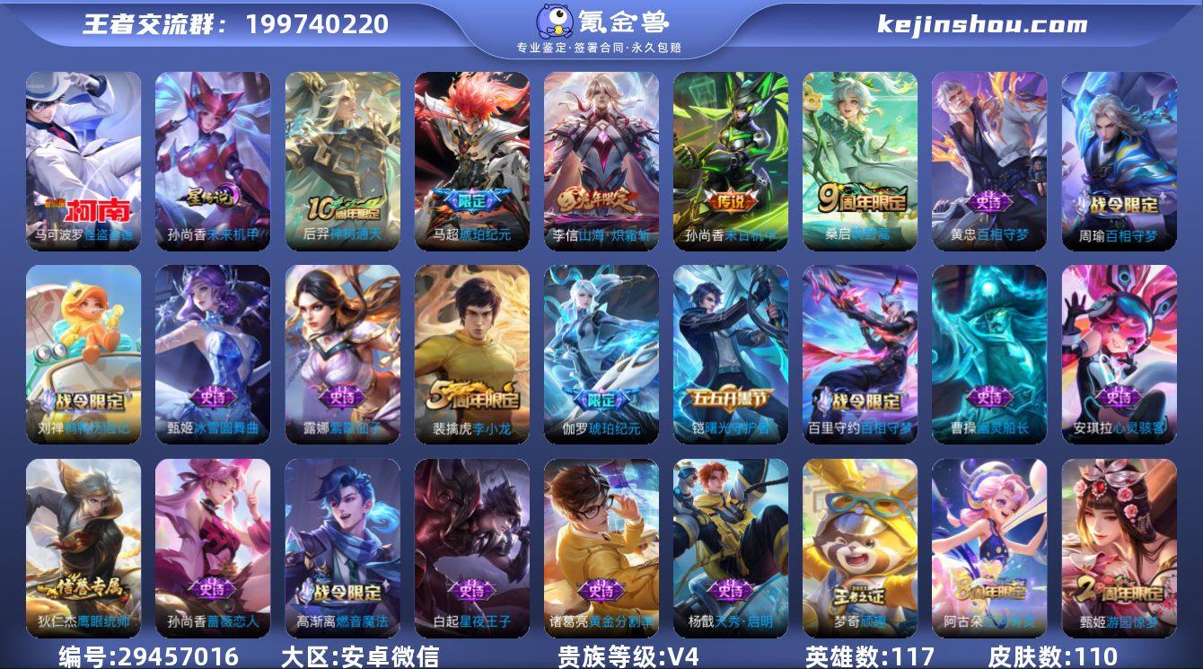 卖家说: 附带火影14s账号+漂泊佩恩,附带部落冲突17本账 号及皇室战争1w杯账号, 吃鸡和QQ飞车分别都充了 400-600,一起赠送出号 荣耀水晶差100多抽保底,1个1.21w孙尚香带粉机甲和按键, 3个1万1,一个万战公孙离,历史巅峰2071,射手基本都有皮 肤,星币还有2200多个,马上可以换下一个星传说,李信年 限+按键, 马可基德+按键,马超琥珀纪元