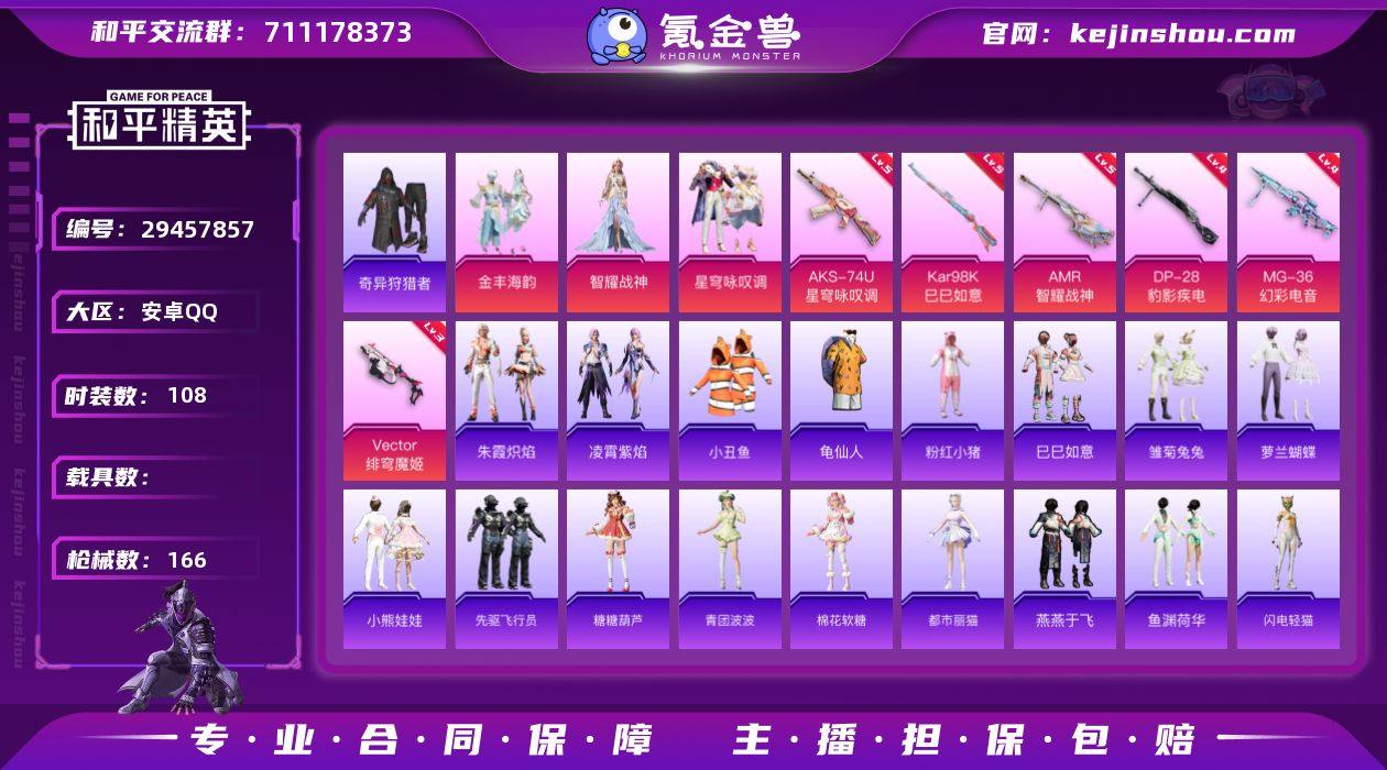 【1437】安卓 手Q-3粉装-6特效枪-0载具-0粉色飞行器-47492热力值-9王牌印记-108套装-166枪皮 【热门品类】:套装-小丑鱼,套装-奇异狩猎者,套装-龟仙人,套装-粉红小猪 【粉色套装】:粉装-金丰海韵,角色-智耀战神,粉装-星穹咏叹调 【粉色枪皮等级】:Vector-绯穹魔姬(三级),AKS-74U-星穹咏叹调(五级),Kar98K-巳巳如意(五级),AMR-智耀战神(五级),DP-28-豹影疾电(四级),MG-36-幻彩电音(四级) 【粉色枪皮】:Vector-绯穹魔姬,AKS-74U-星穹咏叹调,Kar98K-巳巳如意,AMR-智耀战神,DP-28-豹影疾电,MG-36-幻彩电音 【粉色降落伞】:炙焰牛王降落伞,彩虹甜喵降落伞,音爆索尼克降落伞,金丰海韵降落伞,拳皇·狂花道降落伞,未来领航者降落伞,千金淑猫降落伞,临安公主降落伞,智耀战神降落伞,星穹咏叹调降落伞,幻彩电音降落伞,荧海星豚降落伞,喜羊羊与灰太狼降落伞 【稀有套装】:套装-龟仙人,套装-巳巳如意,套装-雏菊兔兔,套装-萝兰蝴蝶,套装-小熊娃娃,套装-先驱飞行员,套装-糖糖葫芦,套装-青团波波,套装-棉花软糖,角色-都市丽猫,套装-燕燕于飞,套装-鱼渊荷华,套装-闪电轻猫,套装-粉恋花,套装-紫幽梦,套装-蓝冰羽,角色-瑰梦爱神,套装-星影赞美诗,套装-星渊小夜曲,套装-彩虹兔,套装-云朵鹅,套装-雪绒豹,套装-朱霞炽焰,套装-凌霄紫焰 【稀有枪皮】:AKM-彩虹符号,AKM-破晓战魂,AKM-虎虎生威,AKM-霓虹街区,AKM-龙的传人,M16A4-幻世战舞者,M16A4-甜心亚梦,M16A4-红色方程式,M16A4-蓝色火焰,SCAR-L-炫彩节奏,SCAR-L-玉兔迎春,SCAR-L-生命誓言,SCAR-L-红色方程式,M416-糯团青竹,M416-红色方程式,M416-蓝色火焰,AUG-天降萌叽,AUG-幻影战神,AUG-甜蜜菠萝,AUG-耀粉歌者,QBZ-彩虹符号,QBZ-神秘黑猫,QBZ-飞驰魅影,M762-天星战神,M762-天降萌叽,M762-云朵鹅,G36...