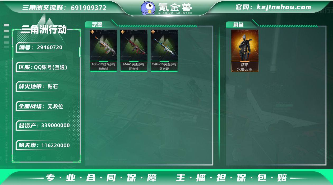 337m资产116m现金烽火60水墨云图 烽火地带段位: 钻石 全面战场段位: 无段位 总资产: 339000000 哈夫币: 116220000 sjs3789 传说武器皮肤: M4A1突击步枪-阿米娅,CAR-15突击步枪-阿米娅,ASh-12战斗步枪-鹅鸭杀 干员外观: 骇爪-水墨云图 亮点: 【sjs3789】总资产:338.7M,哈夫币:11622W,武器皮肤48,烽火60级:钻石,战场10级:无段位,通行证76级:通行证免费版 【安全箱】进阶安全箱;【特勤处等级】仓库LV.7,指挥中心LV.3,训练中心LV.4,靶场LV.4,潜水中心LV.0,收藏室LV.1;【干员皮肤1】:骇爪水墨云图;【已有捆绑包1】:鹅鸭杀捆绑包;【近战皮肤】:近战武器-黑鹰;【步枪皮肤】:SCAR-H战斗步枪-水墨云图,ASh-12战斗步枪-鹅鸭杀,SCAR-H战斗步枪-启航,G3战斗步枪-骑士,CAR-15突击步枪-阿米娅,M4A1突击步枪-阿米娅,AUG突击步枪-蛇,K416突击步枪-银影杀手,CAR-15突击步枪-前沿科技,QBZ95-1突击步枪-公平竞技,M4A1突击步枪-海色,G3战斗步枪-高雅黑,PTR-32突击步枪-黄蜂,M4A1突击步枪-高雅黑,M16A4突击步枪-高雅黑,腾龙突击步枪-三角洲力量,QBZ95-1突击步枪-海色,K416突击步枪-几何解构,K416突击步枪-高雅黑,SCAR-H战斗步枪-数码;【冲锋枪皮肤】:QCQ171冲锋枪-鹅鸭杀,MP5冲锋枪-战术小队,SR-3M紧凑突击步枪-战,勇士冲锋枪-工业狂潮;【射手步枪皮肤】:SR-25射手步枪-天命;【狙击步枪皮肤】:R93狙击步枪-维什戴尔;【轻机枪皮肤】:QJB201轻机枪-鹅鸭杀;【挂饰6】:牛角威龙,挂饰-水墨云图,挂饰-维什戴尔,挂饰-能天使,诡影狙击兵,挂饰-大白鹅;【载具3】:M1A4坦克-护林人,突击直升机-原始伪装,全地形车-森林迷彩;【货币】0三角币,0曼德尔币,80三角券(典藏皮肤颜色请以典藏展示为准,安全箱等时效性道具请以游戏内数据为准)