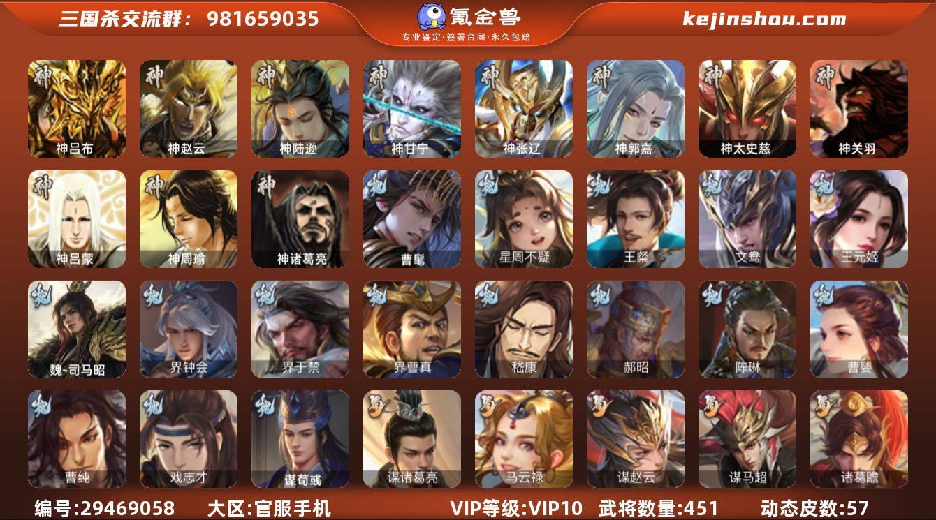【1700】官阶:大将军;VIP等级:VIP10;史诗武将数量:66;动态皮肤数量:57;武将总数:451;史诗宝珠数量:1;将魂数量:910;神将:11;魏国史诗武将:33;蜀国史诗武将:12;吴国史诗武将:8;群史诗武将:29