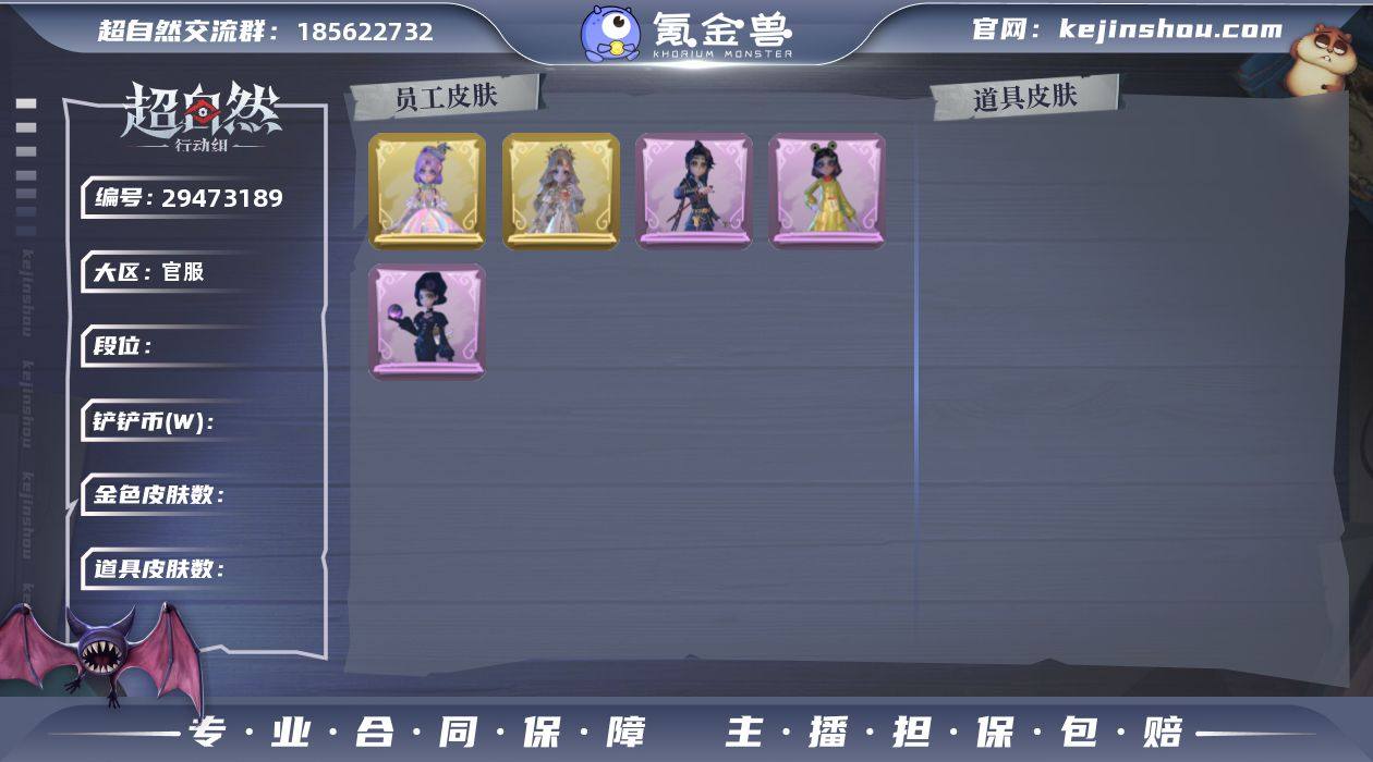段位 超自然传说 员工(9) 逍遥,薇薇安,巫铃儿,莉莉,艾伦,小黄,零,爱丽丝,兰 外观(25) 镜生遗梦,圣光之谕,镜花辞,丝缕哀歌,情公主,嘻嘻头套,烈焰红唇头套,呆滞头套,炙热烧烤,卑微头套,哈士奇头套,滑稽头套,鱼头怪头套,面具马头套,萨卡班甲鱼头套,蝶恋花,钗头凤,呱呱雨衣,绣春逍影,绒团小狐狸,小小情公主,火爆了头套,精致露比头套,惊魂南瓜,樱桃奶油布丁 动作(7) 舞台中心,鹏友摇,抬手,七仔摇,KT猫摇,举牌,luvaboy 道具(13) 龙鳞,凤鸣九天,昆仑镜,伏妖塔,青玉抱丹,飞花令,金丝眼镜,happy猫,桃心,碧络琅环,新星时代,鸣沙鼓,月下莲台A129