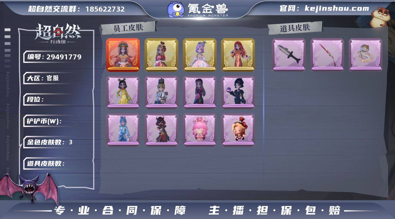 【Q1367】【段位】超自然传说 【幻梦皮肤数量】1 【星耀限定皮肤数量】0 【金色皮肤数量】4 【紫色皮肤数量】20 【道具皮肤数量】44 【铲铲币】47w 【累充】40920金砖 【赛季魔盒】普通魔盒 【员工】莉莉、艾伦、爱德华、兰、小满、临云、小黄、爱丽丝、零、阿念、逍遥、薇薇安、巫铃儿 【幻梦皮肤】巫铃儿-镜生遗梦 【金色皮肤】薇薇安-圣光之谕、爱丽丝-血色中的玛丽、小黄-遗失的童话、巫铃儿-镜花辞 【紫色皮肤】阿念-庆宴绮愿、爱丽丝-耀眼的你、莉莉-除妖小师妹、零-赤炼将军、薇薇安-黑月挽歌、阿念-王子与骑士、莉莉-情公主、艾伦-水王子、爱丽丝-冰公主、小黄-罗丽、薇薇安-白光莹、逍遥-泽引山海、阿念-灵昭鹿鸣、爱丽丝-瑞羽衔春、小黄-霓裳踏雪、零-青云逸歌、巫铃儿-素影瑶光、爱丽丝-丝缕哀歌、逍遥-绣春逍影、小黄-呱呱雨衣 【道具皮肤】喷气背包-晶澜灵翼、铲子-圣心之泪、葫芦-伏妖塔、桃木剑-永眠曲、桃木剑-凤鸣九天、刺刀-小鲨匕首、音响-鸣沙鼓、音响-happy猫、夜视仪-金丝眼镜、铲子-卡皮巴拉小黄豚铲、传送按钮-幻宠之门、刺刀-碧络琅环、传送按钮-昆仑镜、腰包-宝剑八、黄牛能量饮料-青玉抱丹、铲子-焰骨、铲子-龙鳞、短管猎枪-星光的裁决、喷气背包-乘风溯雪、摸金符-花落精绝、腰包-绯红柴郡猫、闪光弹-金戈玄铜、转轮手枪-新星时代、桃木剑-最后的独角兽、额外的背包-飞花令、刺刀-赤色之刃、摸金符-祝祷词、急救包-蔷薇物语、专业手电-云端梦想计划、长鞭-小狗蛇点点鞭、背饰-兔先生的时钟、背饰-云梦之星、背饰-天使的呼唤、背饰-蝶恋花、背饰-毛球夹子、背饰-在逃小新娘、背饰-小小情公主 【头饰】烛光纪念、太空鲨头套、雪墩墩头套、蒜了八、惊魂南瓜头套、小财神豚豚头套、鱼头怪头套、烈焰红唇头套、大葱明头套、火爆了头套、面具马头套、哈士奇头套、萨卡班甲鱼头套、嘻嘻头套...