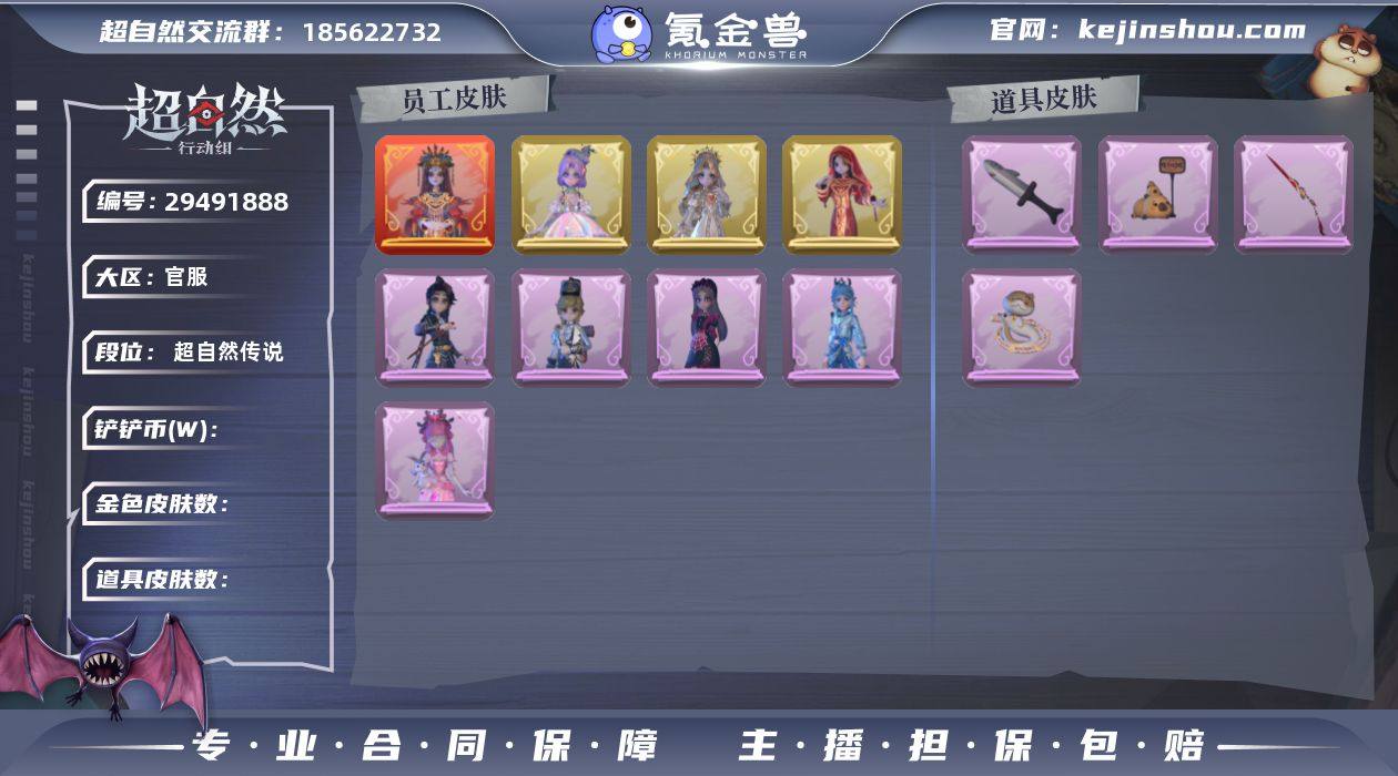 "ZR258 段位:大师 红色皮肤数量:1 金色皮肤数量:2 紫色皮肤数量:2 道具皮肤数量:13 铲铲币:1520000 铲铲币(单位W):152 员工:小黄 爱丽丝 零 逍遥 薇薇安 巫铃儿 艾伦 爱德华 小满 外观:巫铃儿 镜生遗梦 小黄 炽天使 巫铃儿 镜花辞 艾伦 水王子 薇薇安 白光莹 道具:夜视仪 金丝眼镜 音响 鸣沙鼓 传送按钮 逆时审判 黄牛能量饮料 青玉抱丹 音响 happy猫 急救包 蔷薇物语 传送按钮 昆仑镜 葫芦 伏妖塔 桃木剑 凤鸣九天 铲子 龙鳞 额外的背包 飞花令 背饰 蝶恋花 头饰:鱼头怪头套 烈焰红唇头套 火爆了头套 面具马头套 哈士奇头套 萨卡班甲鱼头套 嘻嘻头套 滑稽头套 呆滞头套 卑微头套 像素朋克墨镜 后室幸存者头套 挂饰:尘封旧事 九色祥鹿 钗头凤 动作:孤身摇 知世摇 luvaboy 鹏友摇 伤心摇 舞台中心 举牌 抬手 累充:11620金砖 赛季魔盒:普通魔盒"