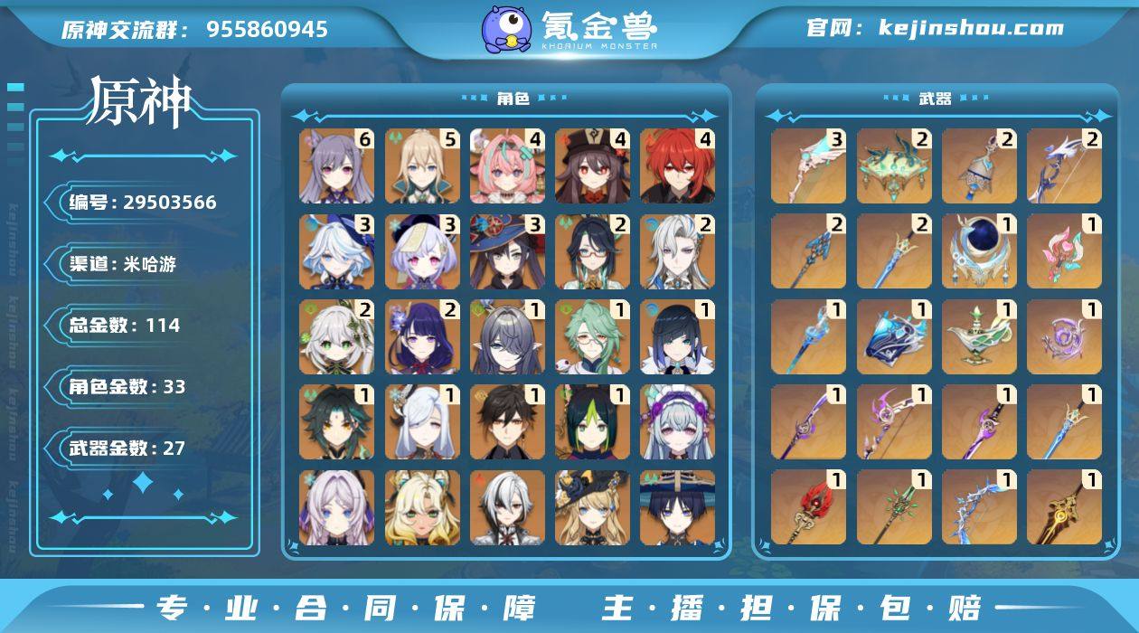 四命瓦蕾莎,四命胡桃,三命芙宁娜,二命龙王,二命雷神,二命草神,二命闲云,百金账号其它如图,有胡桃和刻晴皮肤,带一百二十多抽,可抽满命瓦蕾莎,欢迎有需要的朋友咨询拍,谢谢!