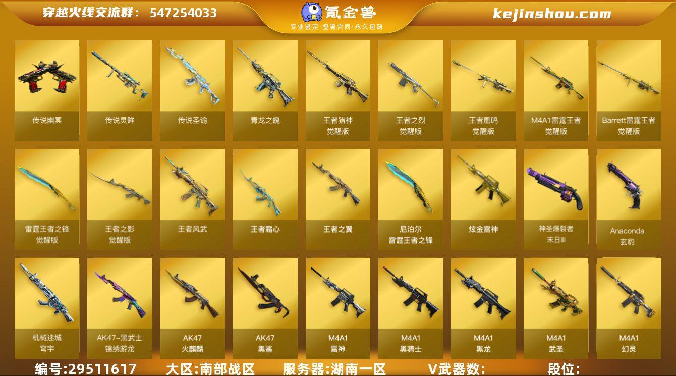 实名: 可修改 排位资格: 有 V武器: AK47-火麒麟,AK47-黑鲨,M4A1-雷神,M4A1-黑骑士,M4A1-黑龙,M4A1-武圣,Barrett-毁灭,Barrett-极光,Barrett-朱雀,AWM-天龙,AA-12-雷霆,AK12-天启,QBZ03-金色蔷薇,沙鹰-修罗,屠龙,龙啸,麒麟刺,擎天,M4A1-幻灵,雷神-荣耀世冠,幻灵之锋,M14EBR-玄武,传说灵眸,传说幽冥,龙啸-烈火龙威,AK47-黑武士-锦绣游龙,迷你泡泡象,传说圣谕,机械迷城-穹宇,Anaconda-玄豹,神圣爆裂者-末日III 王者武器: 王者之翼,雷霆王者之锋,王者霜心,青龙之魄,王者风武,王者之影-觉醒版,雷霆王者之锋-觉醒版,Barrett-雷霆王者-觉醒版,M4A1-雷霆王者-觉醒版,王者凰鸣-觉醒版,王者之烈-觉醒版,王者猎神-觉醒版 炫金武器: 炫金雷神 热门武器: Cat-刀锋,火麒麟-灵狐,毁灭-孙三炮,牛牛-AK47,USP-嘉年华柯基,Scar Light-马枪 狙击枪稀有皮肤: 毁灭-战神张飞,毁灭-青帝,毁灭-神秘黑洞,M200-幻神-荣耀世冠白鲨,毁灭-墨兰 皮肤,幻神-星耀 皮肤,毁灭-战神张飞-网吧特权,极光-高能霹雳 英雄角色: 王者涂鸦,雾萌萌,隼,岚兮儿,传说影煞,隐 音效道具: AK47-火麒麟音效卡,Barrett-毁灭音效卡,金色蔷薇音效卡