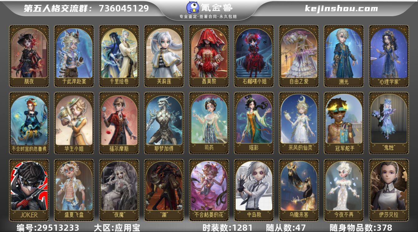 出红夫人,红蝶,渔女大情号。JOKER(杂技演员),十三娘(红蝶) ,太宰治(囚徒),日向创(勘探员),,赤宴(红夫人),雨宫莲(杂技演员), 中岛敦(佣兵),寒香舞(空军),明日之辉(祭司) ,珊瑚夫人(调香师),怪盗基德(先知),明智吾郎(大副) ,裁决之酒(调酒师) ,初拥(邮差) ,太宰治(囚徒),采风的仙灵(气象学家),司药(医生),恒梦(心理学家) ,福尔摩斯(小说家) ,不合时宜的危鲁弗(弓箭手), 怒火(蜡像师),巴萨丽莎(歌剧演员) ,静默之戟(渔女) ,夜魔(雕刻家),永夜极光(红蝶),壹原侑子(红蝶),变脸王(小丑),伊莎贝拉(红夫人),川上富江(梦之巫女) ,信使(梦之巫女),华生(记者),石榴蝶小姐(小女孩),于此岸赴宴(幻灯师),芙莉莲(气象学家),聂莫黎(调香师)等多款绝美限定时装 还有29758紫薯, 包含王者账号v10有484皮肤 :还包含有英雄联盟,云顶之弈,金铲铲,蛋仔派对,意因为金铲铲被封了一年所以减价了