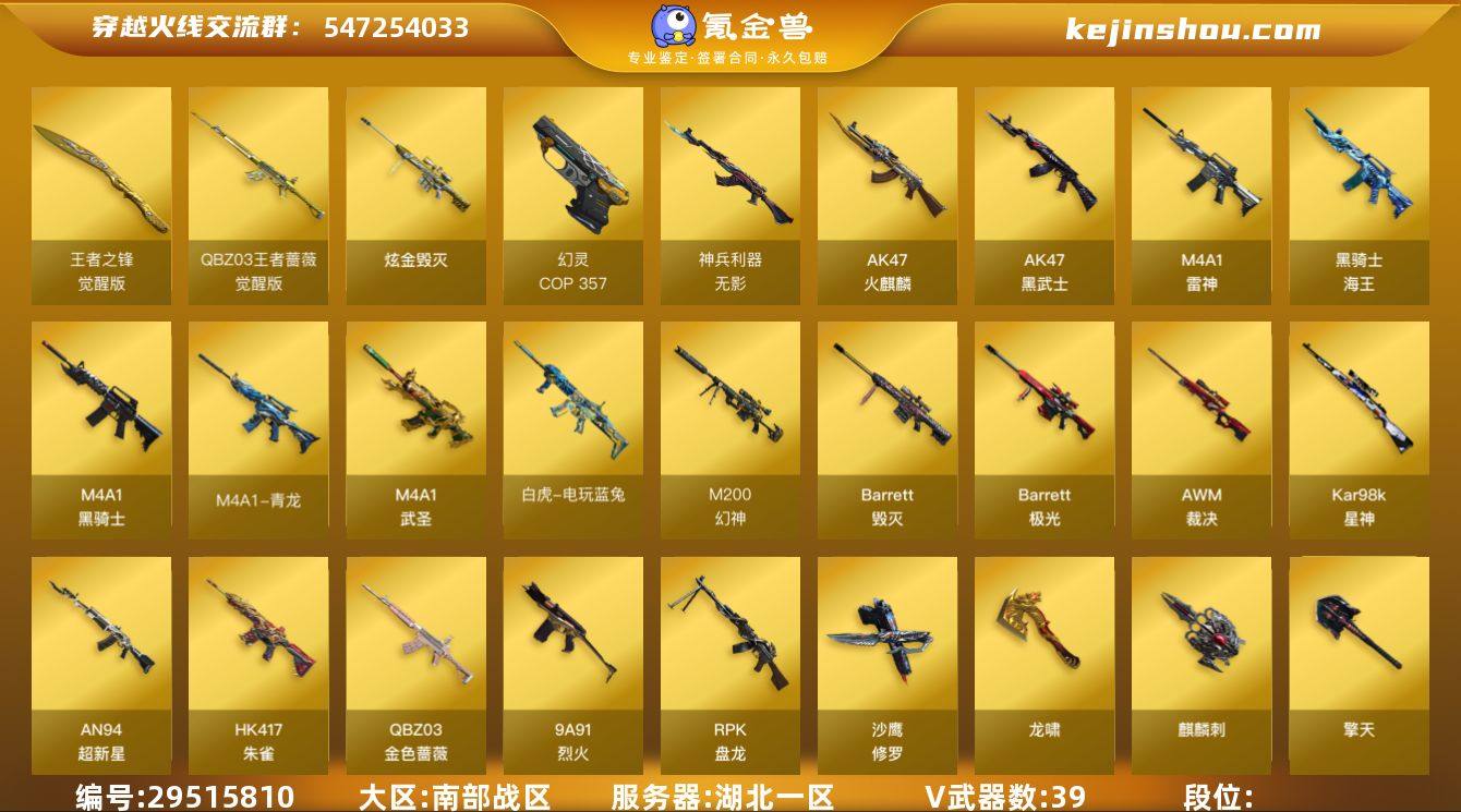 南部战区(湖北一区)39v【M200-幻神套装+双皮/电流骇客/黄忠,Kar98K-星神+双皮/璀璨/漫游,QBZ03-金色蔷薇,HK417-朱雀,QBZ03-王者蔷薇,白虎-电玩蓝兔,AWM-裁决,COP357-幻灵*2,金刚伞-电玩红兔,Colt1911-大黄蜂,Colt1911-小故障】2王者【QBZ03-王者蔷薇,王者之锋】1炫金【炫金毁灭】5角色【四防关小雨,葵,乔伊教练,四防王者葵-貂蝉,云海玲珑,灵动武士】3音效【M200-幻神音效卡,Barrett-毁灭音效卡,M4A1-黑骑士音效卡】22皮【幻神-电流骇客,幻神-黄忠,星神-璀璨,星神-漫游,火麒麟-白虎,黑骑士-摸金校尉,火麒麟-心动糖果,毁灭-耀金,雷神-星空,毁灭-墨兰,火麒麟-传奇EVEN,千变-孔明,火麒麟-平天大圣,火麒麟-CF STAR,雷神-虎将】截图展示段位不代表实际段位 如赛季更新等不可抗拒因素发生变化、时限道具不保证所剩时间