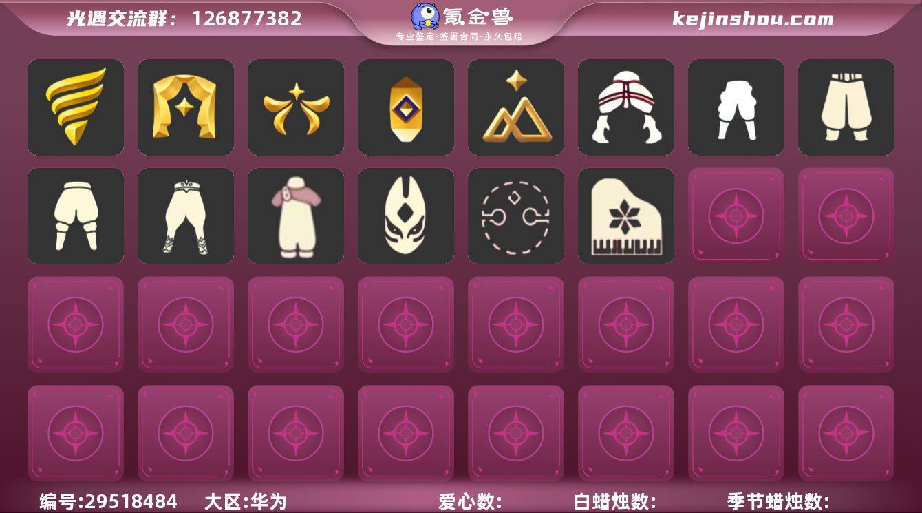 账号类型: 手机账号 季节已毕业: 潜海季,表演季,破晓季,欧若拉季,夜行季,追忆季,九色鹿季 完成地图: 晨岛,雨林,霞谷 珍稀物品: 白枭,透明蝶翼斗 礼包: 蝙蝠套,巫师,围巾,九色鹿角,绊爱,鹿角,运动鞋,秋千,白绒金,福娃,吉他,彩虹帽,橘子,贝壳,红伞,兔子,枯角,雪花,星月头饰,彩虹耳钉,彩虹耳机,新年裤,蝴蝶结,四叶草,爱心眼镜,新年耳钉,创始人,姆明饰品套装,青衫落拓礼包 裤子: 武士裤,背带裤,搓澡巾,蓝绿裤,飞天裤 面具: 呼吸面具,夜行毕业面具,黄眉企鹅面具 面饰: 红耳机 项链: 围巾 发型: 若笠,虚荣,单侧绑发,留辫蘑菇头,飞天盘发 头饰: 平顶帽 斗篷: 海洋斗,绿芽,粉红绒毛斗篷,遥鲲斗篷,燕尾斗篷,冥龙斗篷 配饰: 高音钢琴,鲲灯 亮点: 【优质装备】:表演季,白枭(帝企鹅发),武士裤,潜海季,破晓季,透明蝶翼斗,欧若拉季(欧若拉),高音钢琴(白色高脚钢琴),夜行季,追忆季,九色鹿(九色鹿季),蓝绿裤(高领舞服),飞天裤(柔缎花边连)(九色鹿丝带裤),围巾(肩带),呼吸面具(潜水面具),夜行毕业面具(棕熊面具),黄眉企鹅面具,单侧绑发(单边小辫),留辫蘑菇头,粉红绒毛斗篷(绒毛斗篷),遥鲲斗篷(双翼遥鲲斗),燕尾斗篷,冥龙斗篷,鲲灯(追忆之书),飞天盘发(九色鹿丸子头),蝙蝠套(蝙蝠斗篷)(南瓜头),福娃(福娃礼包)(春之日礼包)(铜钱斗),绊爱(绊爱斗篷)(绊爱礼包),秋千(情人秋千),红耳机,围巾(小王子斗篷)(小王子围巾),九色鹿角(神鹿祝福头饰)(神鹿祝福礼包),鹿角(圣诞鹿角),吉他(音韵吉他)(白吉他),红伞(瑞气纸伞),姆明饰品套装(姆明尾巴),巫师(巫师帽),白绒金(白雪斗篷),彩虹帽(多彩绒帽),枯角(巫树犄角),彩虹耳机,新年裤(瑞气服饰),晨岛,雨林,霞谷,若笠(箬笠),运动鞋(跃动跑鞋),星月头饰(星月头冠),蝴蝶结(大蝴蝶结),爱心眼镜,创始人(创始人斗篷),青衫落拓礼包,兔子(玉兔头饰)(玉兔发饰)(兔子发饰),彩虹耳钉(彩虹耳饰),雪花(雪花发夹),...