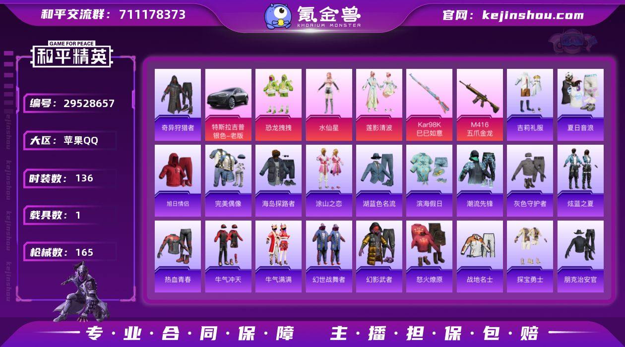 IOS 15印记 素材号 猫包 老六服 奇异狩猎者 3粉2枪1载具 雪山精英 恐龙拽拽 莲影清波 水仙星 恐龙拽拽 酣梦娃娃 诡谋托雷基亚 银白舞王 萌趣颜团子 街头潮人 柠萌假日 幻影武者 炫蓝之夏 满级M416-五爪金龙 2级98k-巳巳如意 特斯拉MdoelX(冷光银) 王牌印记15 热力值52217 K25948 和平精英买号永久包赔带二次营地ID:721417349